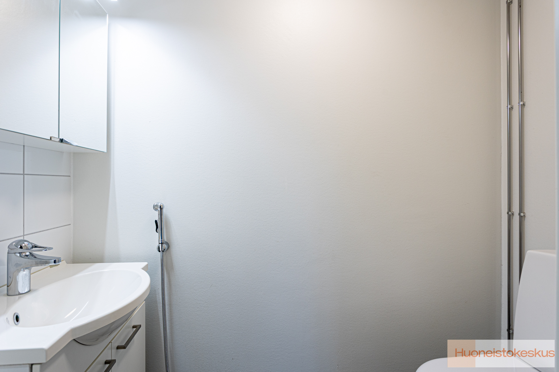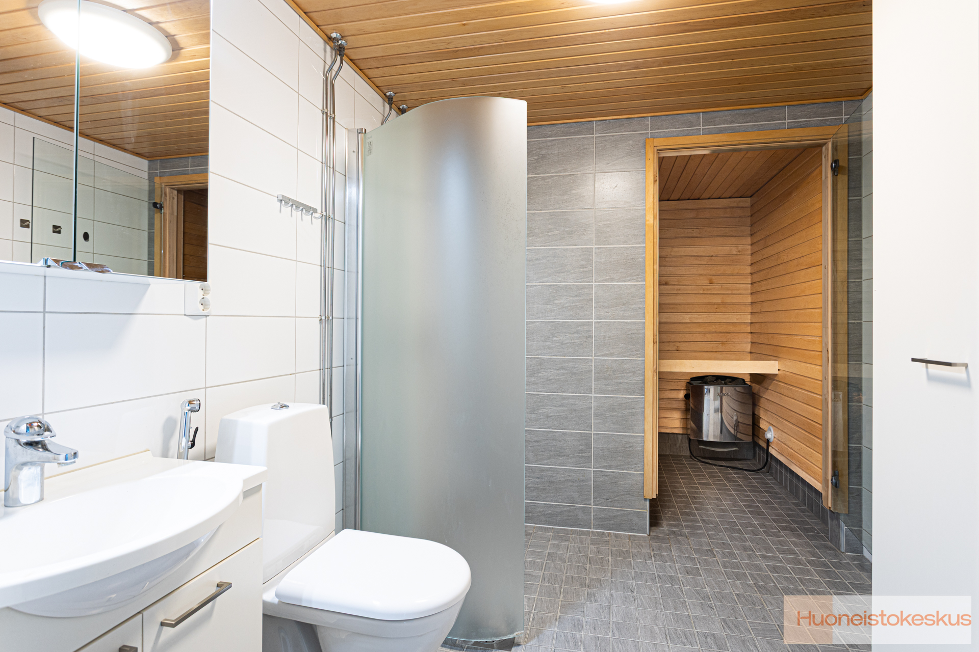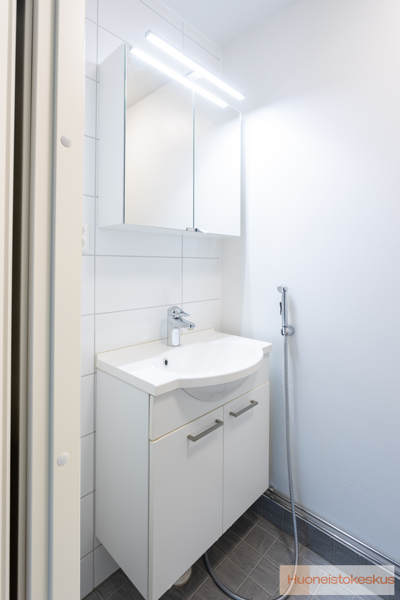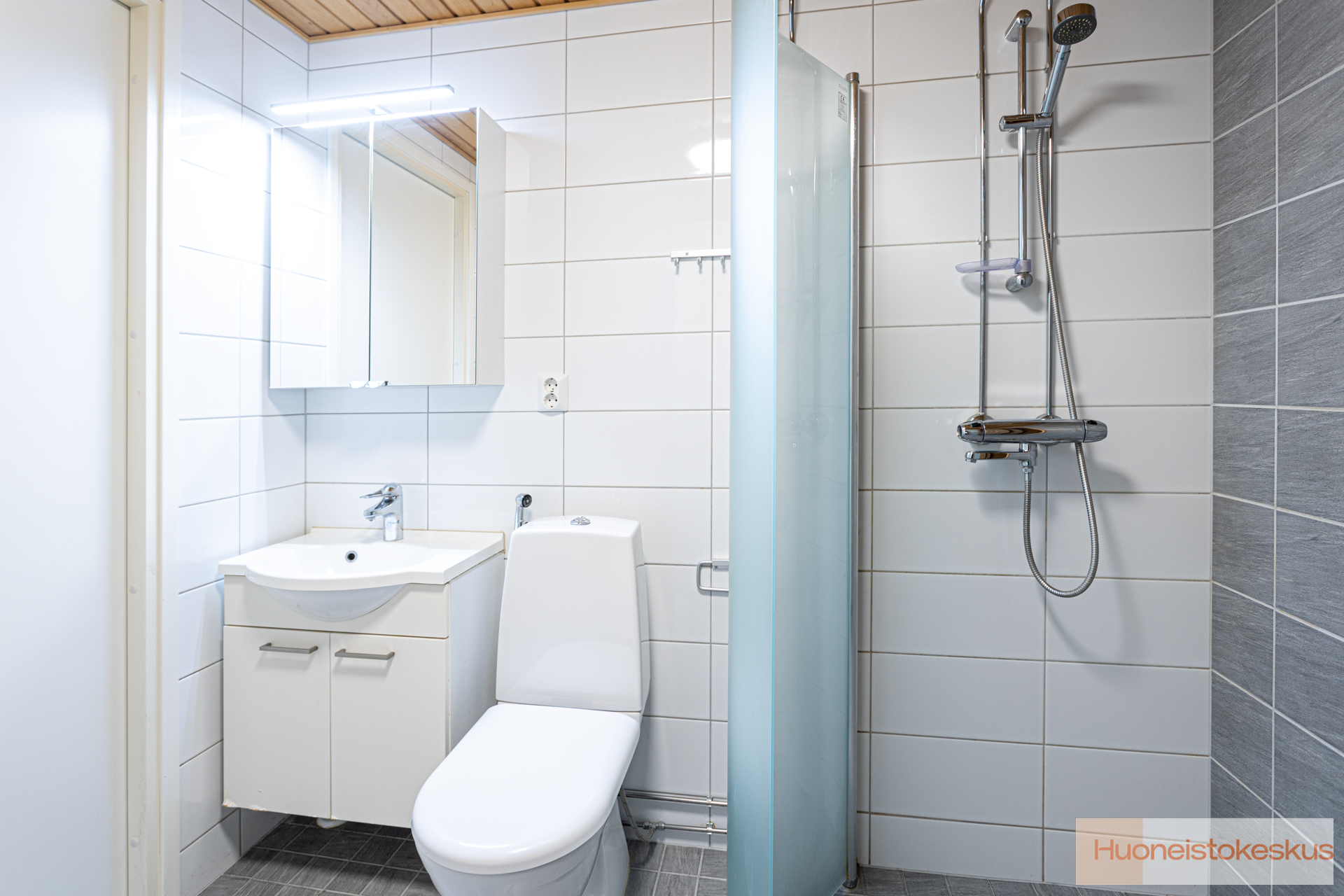 | Kylpyhuoneen kuvaus | WC-istuin, suihku, suihkuseinä, pesukoneliitäntä, lattialämmitys ja peilikaappi, seinät (kaakeli), lattiat (laatta) |