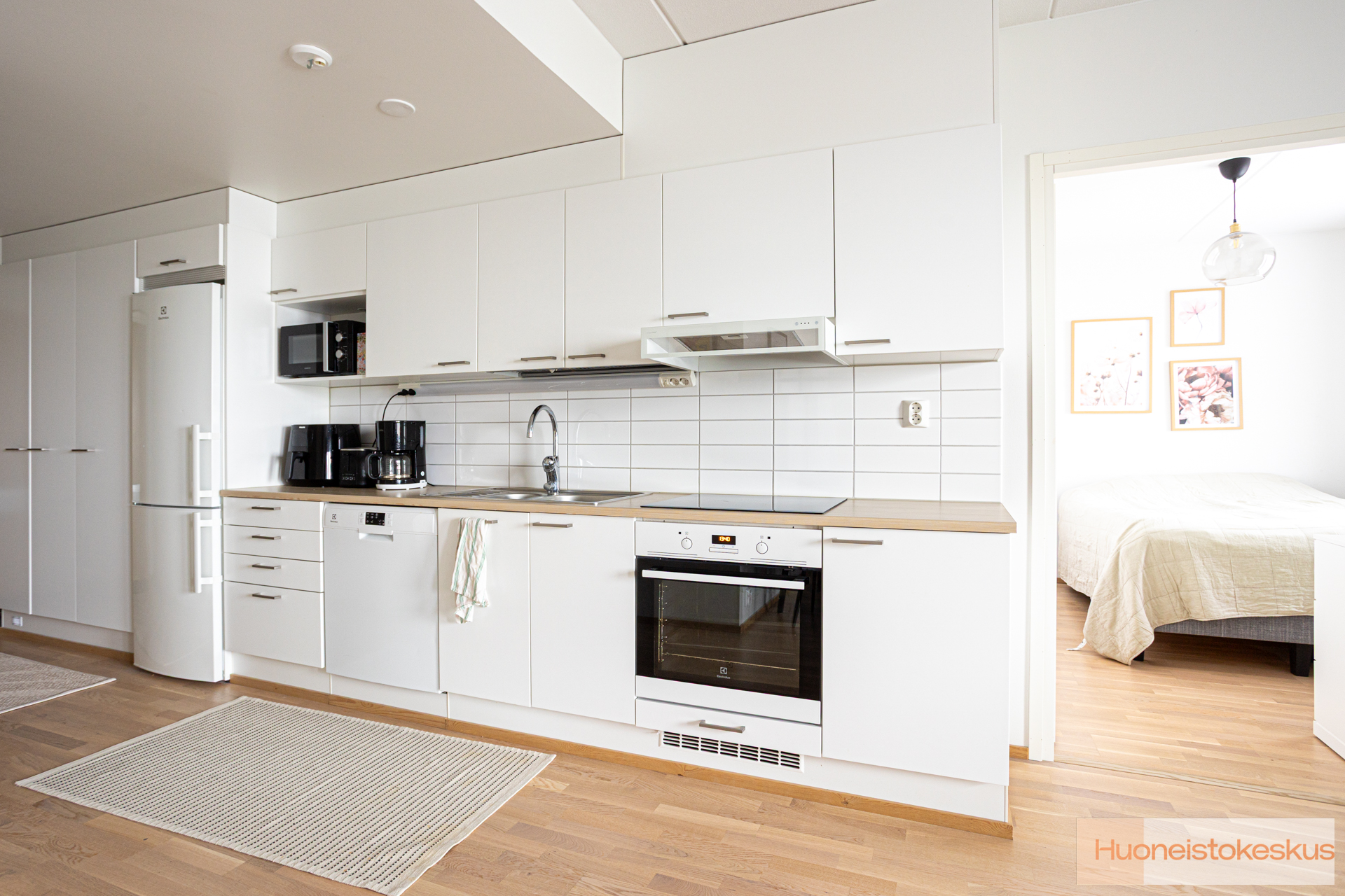 Neljäntenä kerroksena sijaitseva koti tarjoaa laadukkaat materiaalit, kuten kauniin parkettilattian ja modernin, hyvin varustellun keittiön (astianpesukone, keraaminen liesi). Tilava ja lasitettu parveke tuo mukavasti lisätilaa arkeen, ja parvekkeen huolto on juuri valmistunut, joten se on huolettomassa käyttökunnossa.