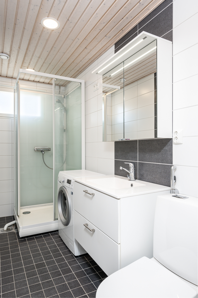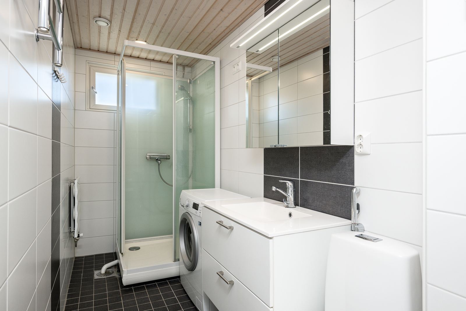 | Kylpyhuoneen kuvaus | Suihkukaappi, peilikaappi, pesukone, allaskaappi, suihku ja wc-istuin, seinät (kaakeli), lattiat (laatta) |