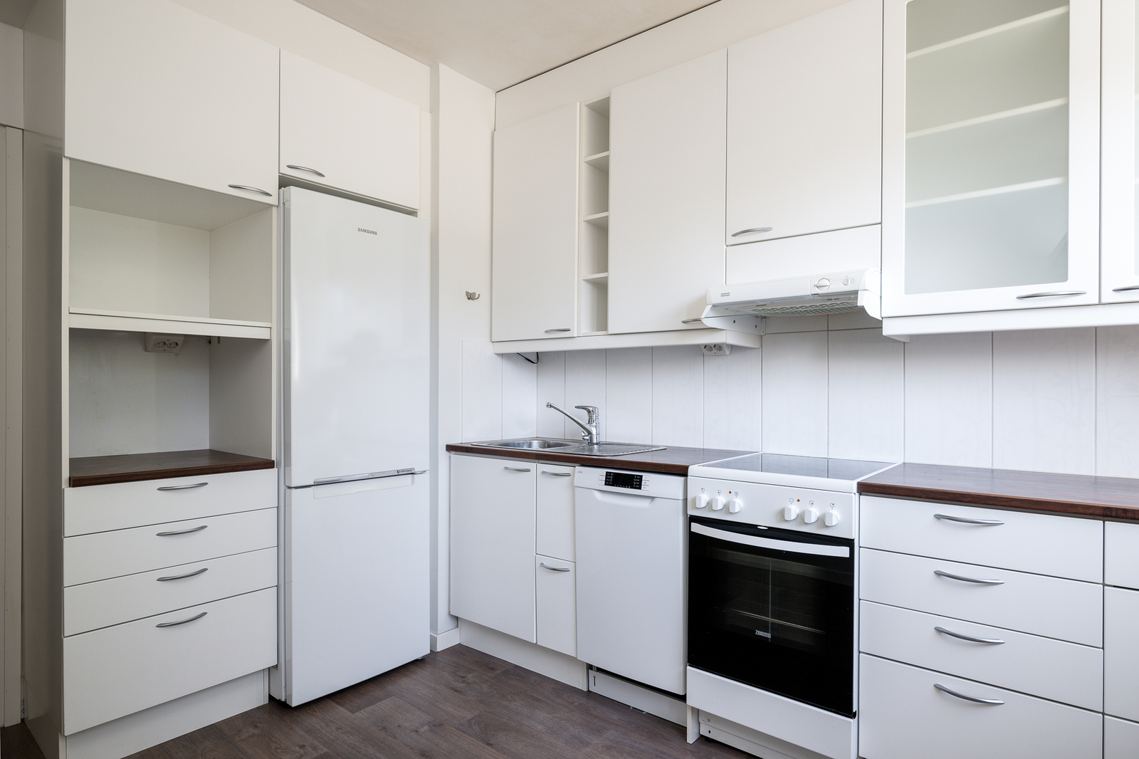 | Keittiön kuvaus | Liesi (Keraaminen liesi), työtasot (laminaatti), seinät (maali), lattiat (vinyyli), liesituuletin, jääkaappipakastin ja astianpesukone |