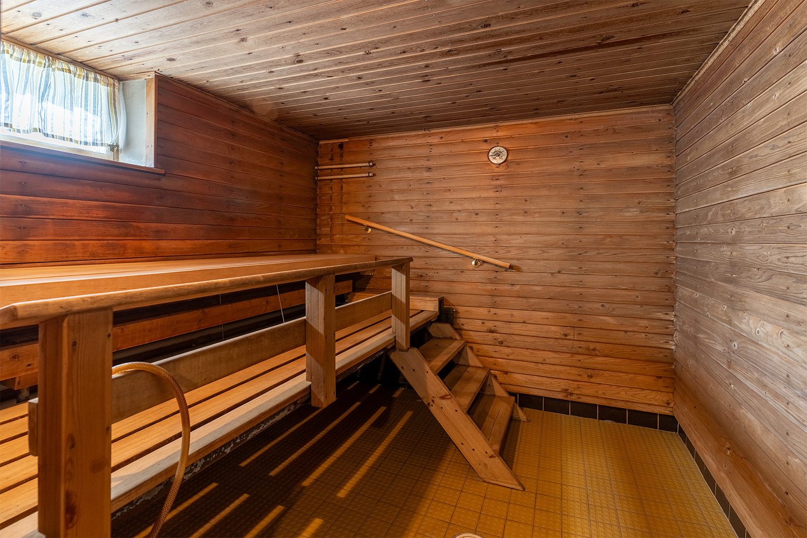 | Saunan kuvaus | Seinät (puu), lattiat (laatta), Puukiuas |