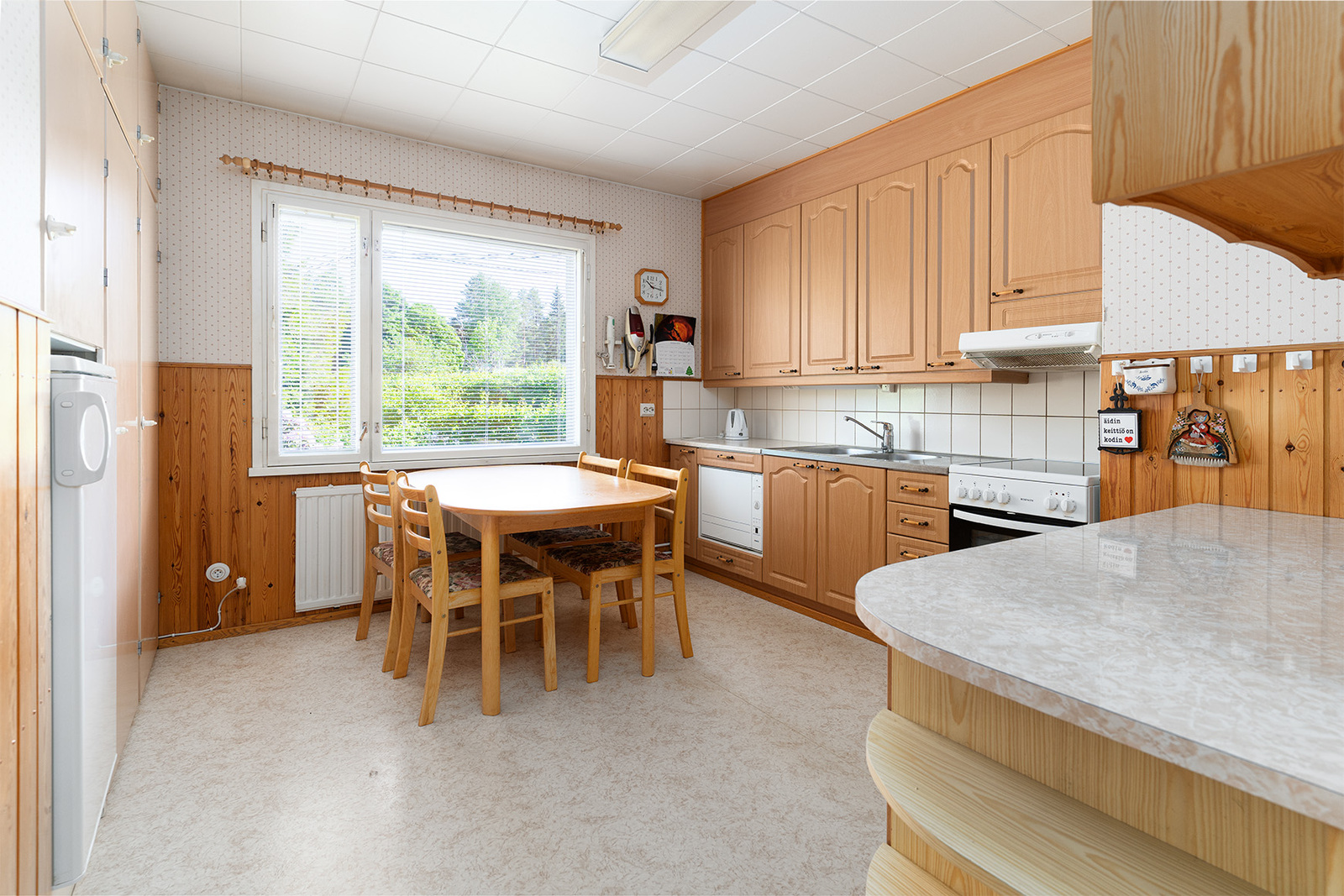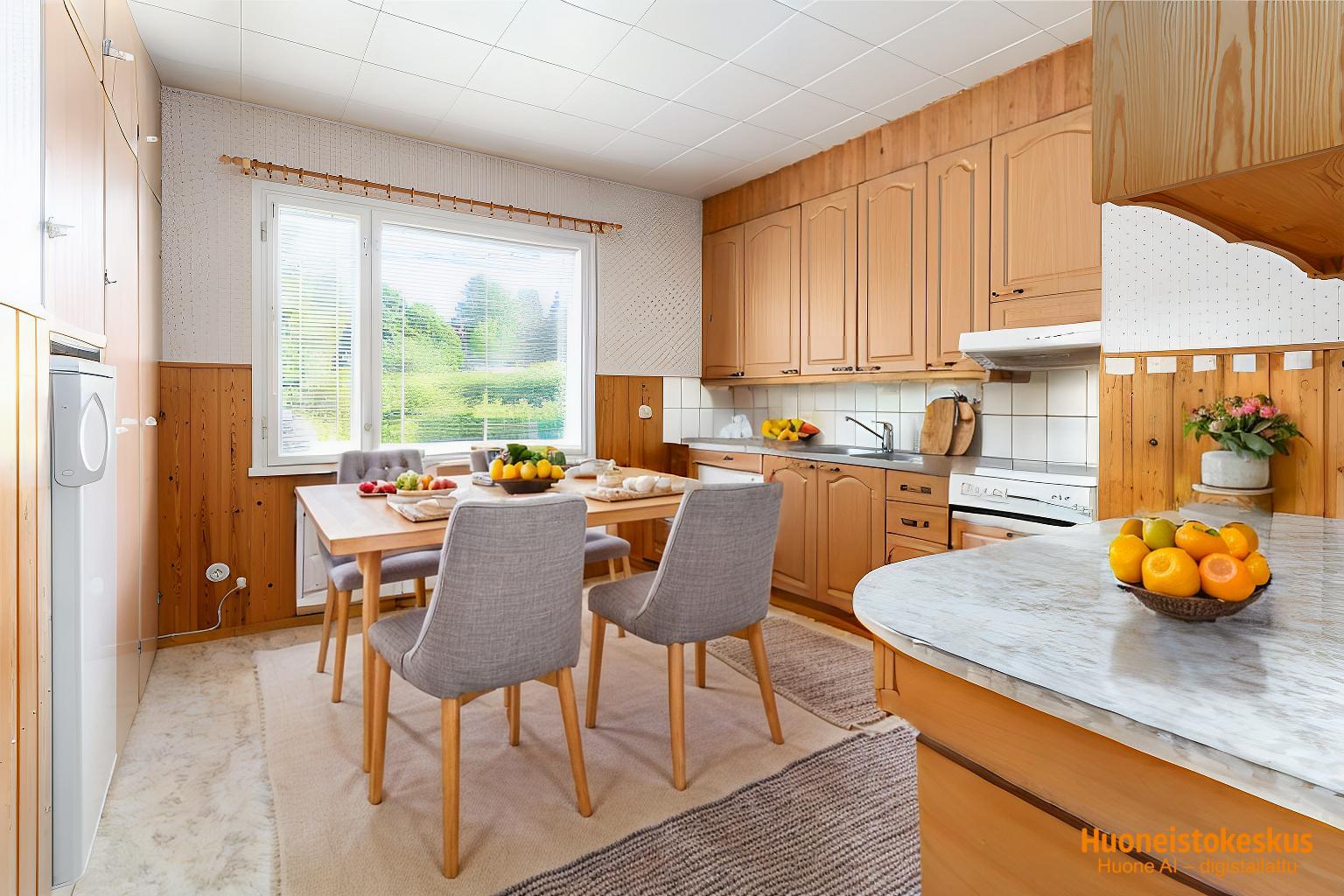 | Keittiön kuvaus | Liesi (Keraaminen liesi), seinät (tapetti), lattiat (muovimatto), jääkaappi, liesituuletin, astianpesukone ja kiinteät valaisimet |