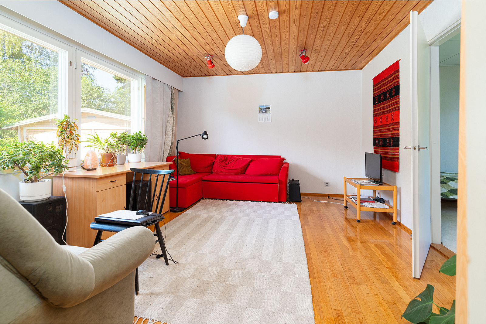 Laajennusosa on erillinen kaksio, jonka voi vuokrata, tai johon voi vaikkapa perheen jälkikasvua sijoittaa, toimii mainiosti myös isovanhempien asuntona. Kaksio on nyt vuokrattuna.