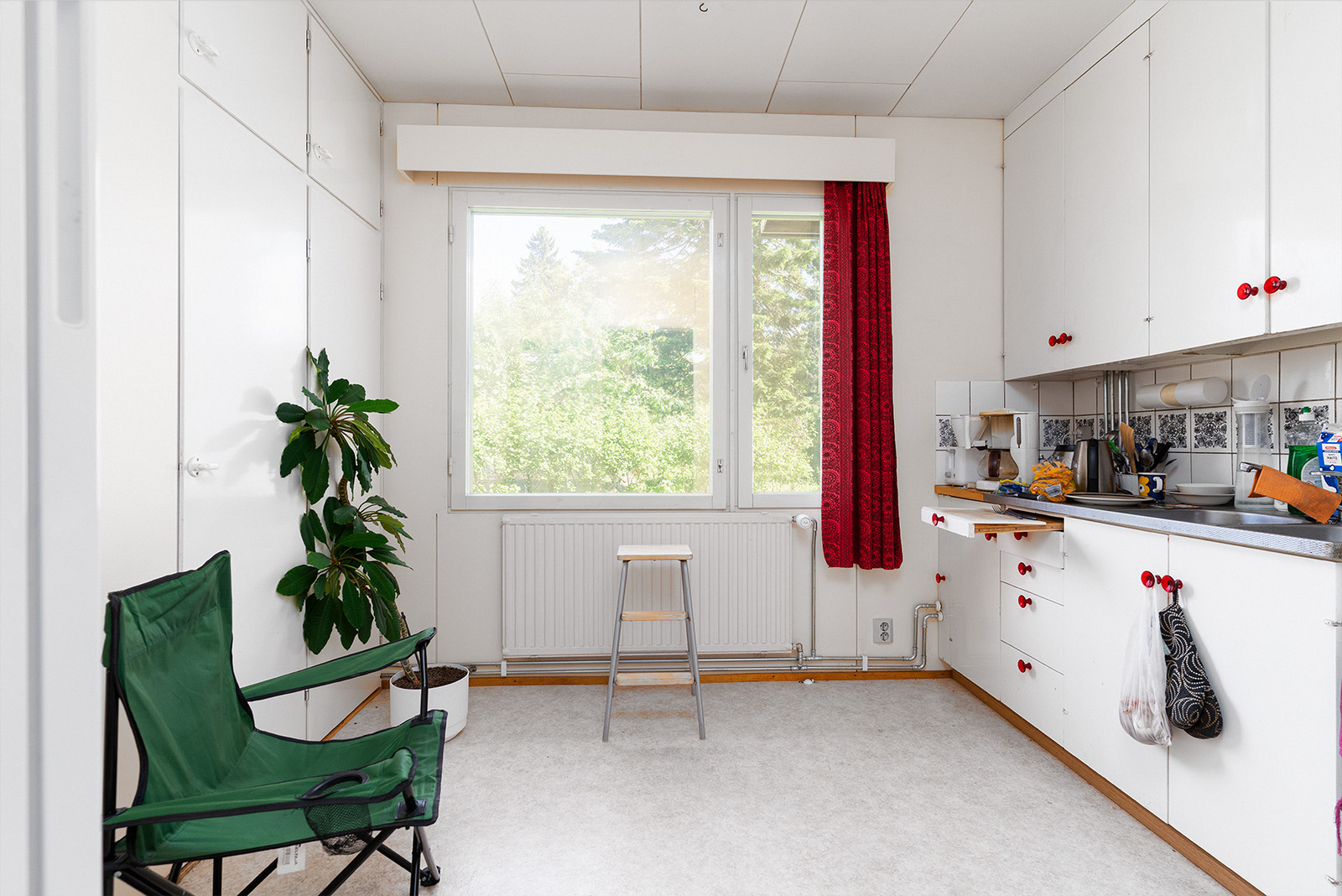 | Muuta kauppaan kuuluvaa | Lisätietoja sisältyvistä varusteista: istutukset, kaapistot, kiinteät valaisimet, matontamppausteline, sälekaihtimet/rullaverhot, verhotangot |