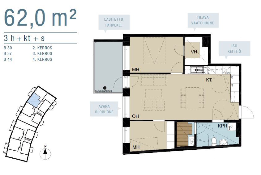 Tämä koti sopii niin lapsiperheelle kuin tilaa kaipaavalle pariskunnallekin. Pohjaratkaisu on erittäin käytännöllinen. Kaksi makuuhuonetta, joissa yhdessä on vaatehuone ja kahdessa säilytystilaa kaappien muodossa. Eteisessä kaappitilaa on runsaasti lisää. Keittiö toimii asunnon keskiössä yhdistyen olohuoneeseen.
