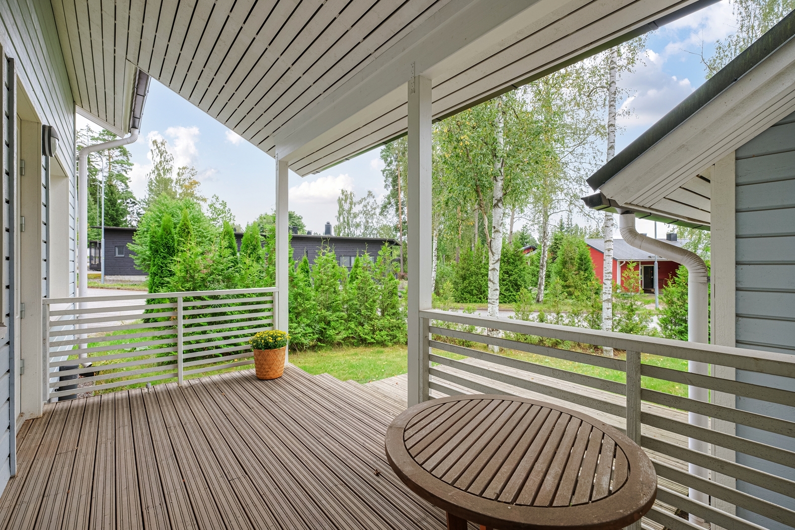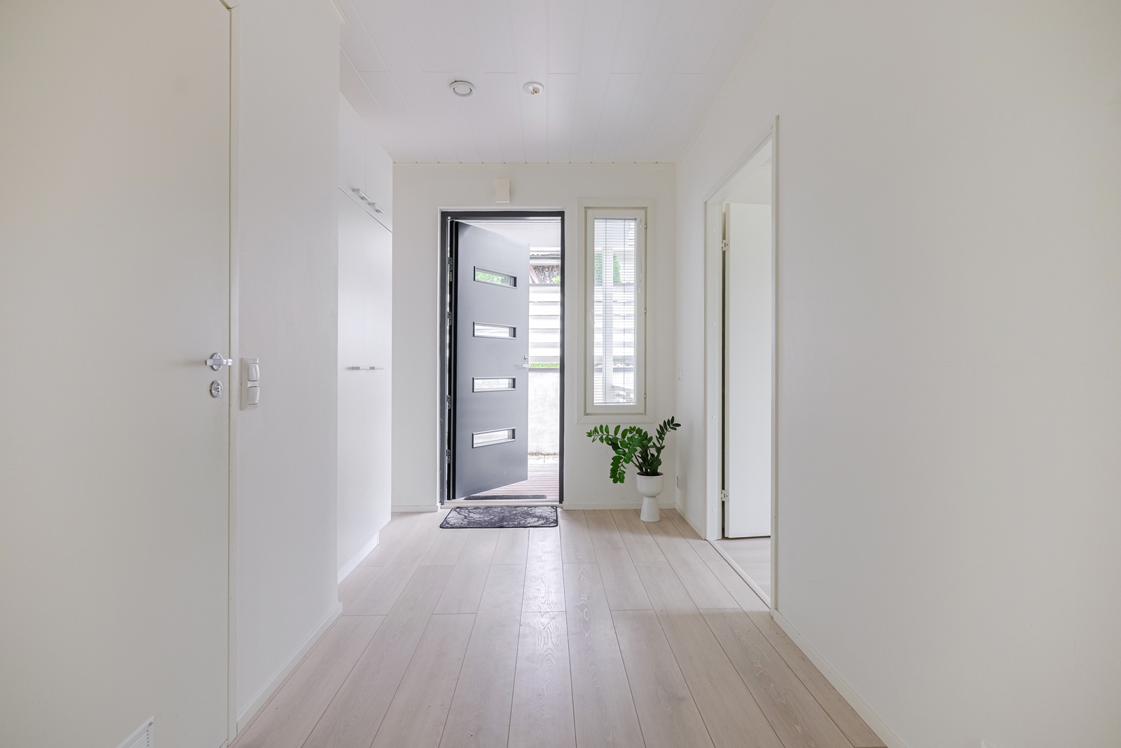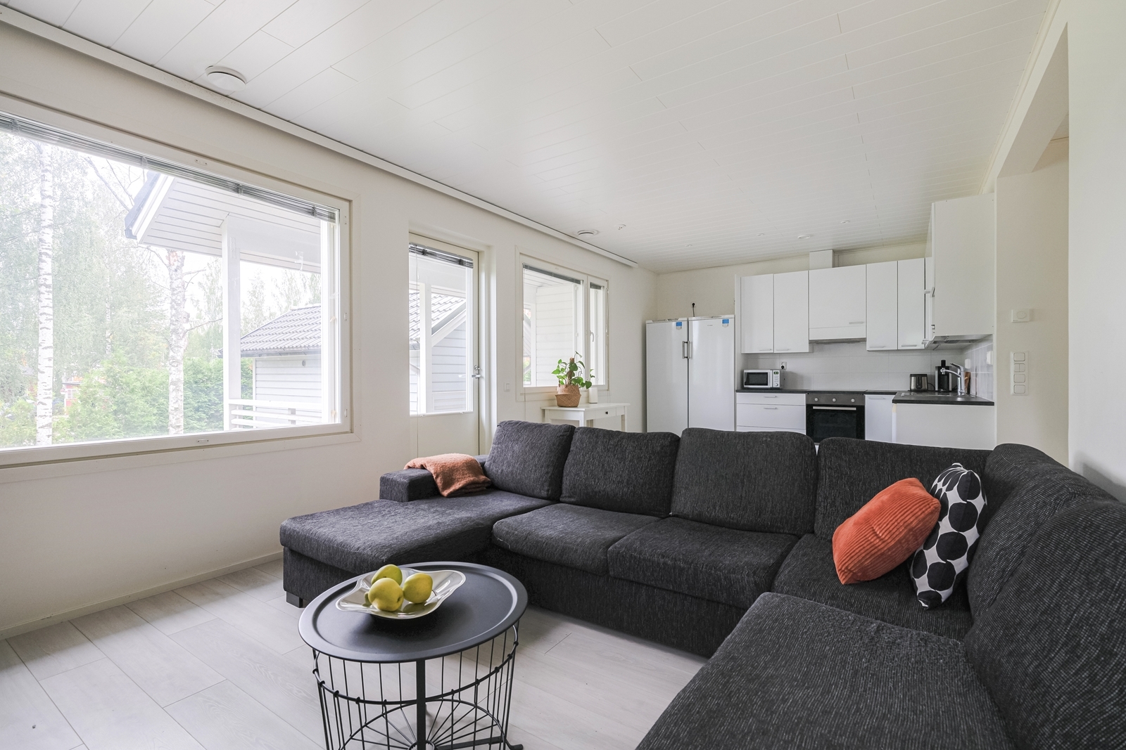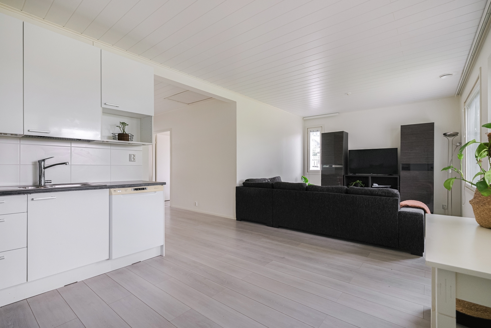 Valoisa keittiö ja olohuone ovat yhtenäistä, avaraa tilaa ja tarjoaa mahdollisuuden niin oleskeluun kuin arjen askareisiinkin. Olohuoneesta käynti katetulle terassille ja hyvän kokoiselle piha-alueelle. Asunnon yhteydessä on käyttöullakko, joka tuo runsaasti lisätilaa säilytykseen.