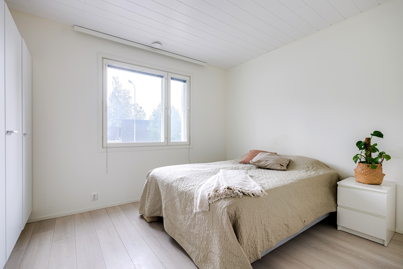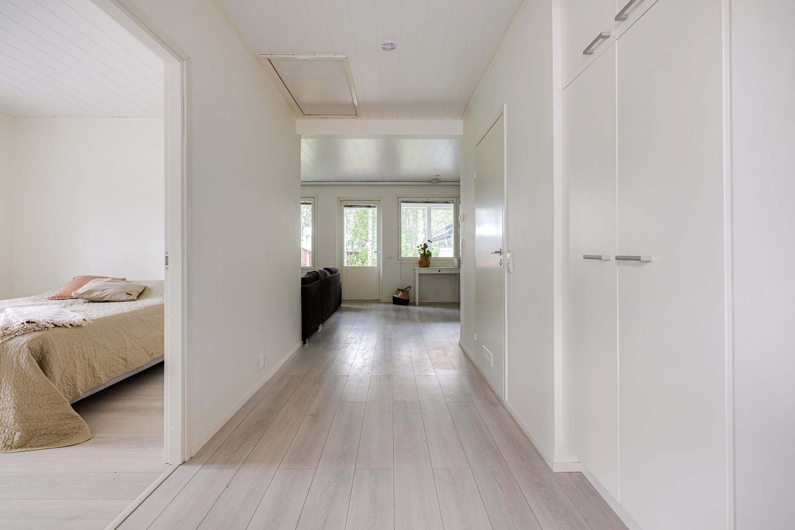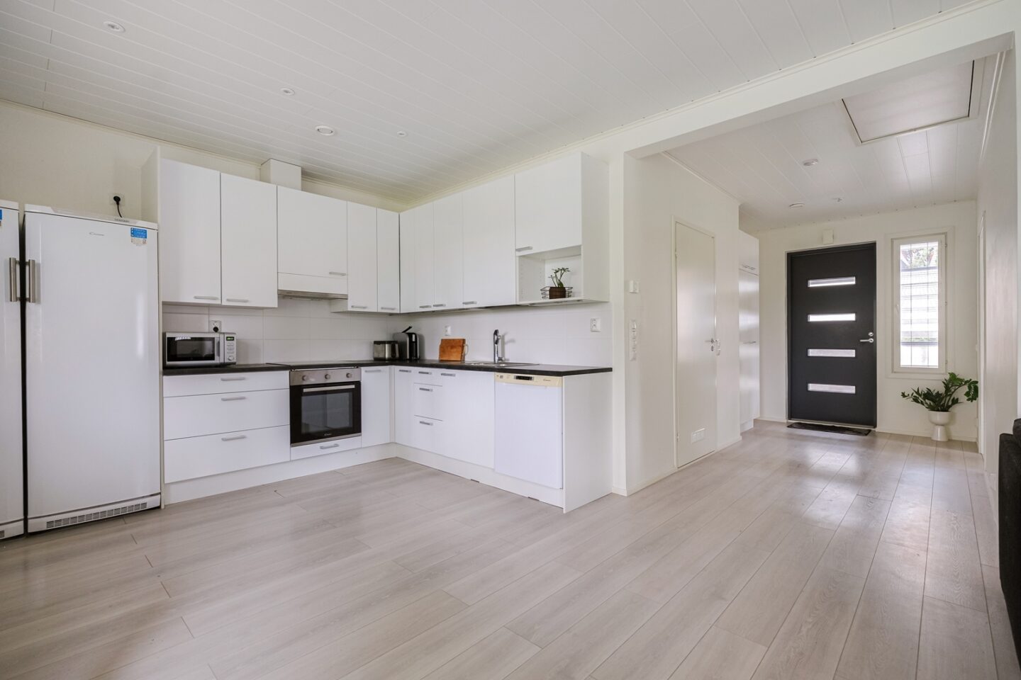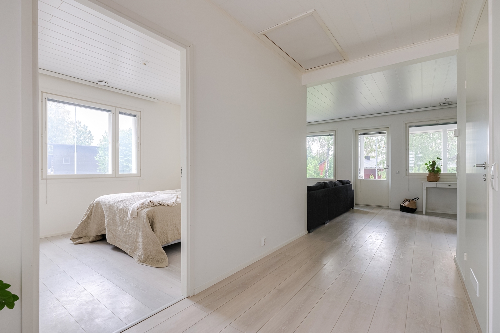 Valoisa keittiö ja olohuone ovat yhtenäistä, avaraa tilaa ja tarjoaa mahdollisuuden niin oleskeluun kuin arjen askareisiinkin. Olohuoneesta käynti katetulle terassille ja hyvän kokoiselle piha-alueelle. Asunnon yhteydessä on käyttöullakko, joka tuo runsaasti lisätilaa säilytykseen.