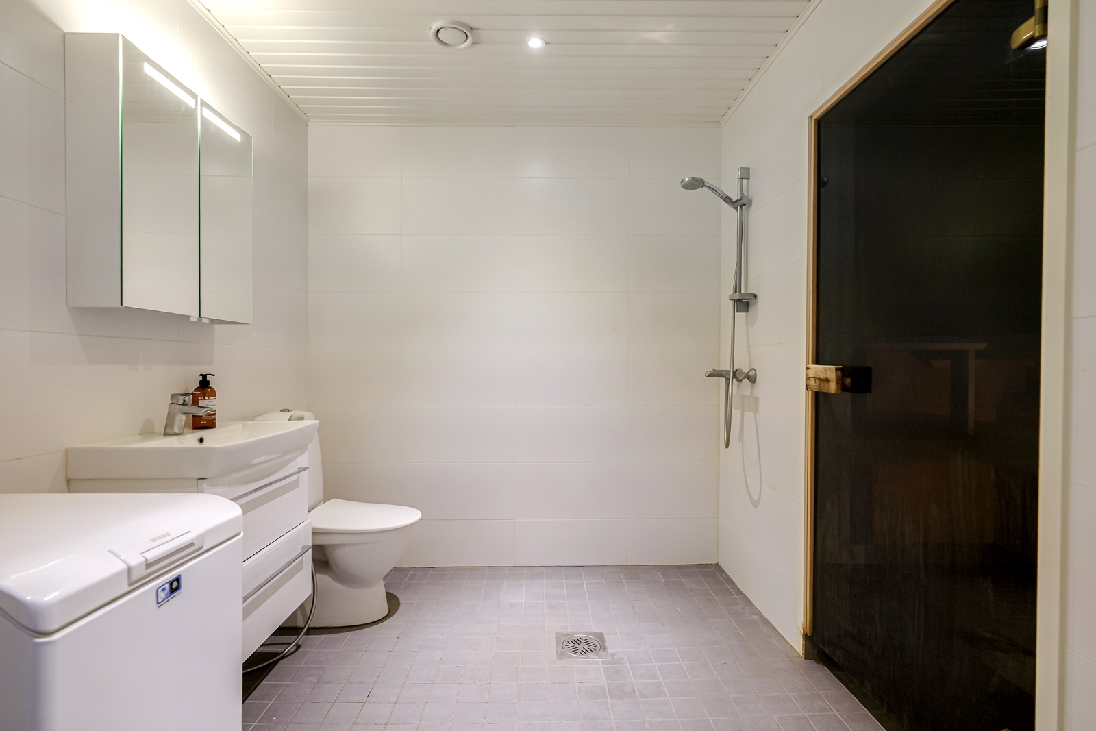 | Kylpyhuoneen kuvaus | Pesukoneliitäntä, wc-istuin, peilikaappi, suihku ja kiinteät valaisimet, seinät (kaakeli), lattiat (laatta) |