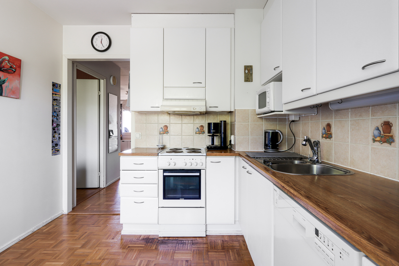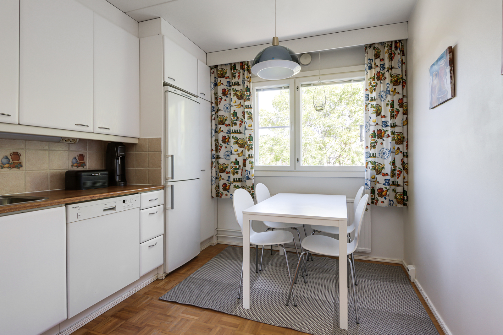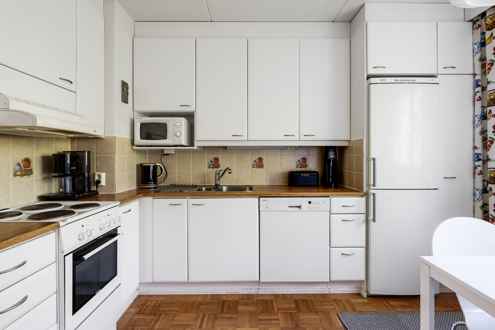 | Keittiön kuvaus | Liesi (sähköliesi), työtasot (puu), seinät (maali ja osalaatoitus), lattiat (parketti), liesi, astianpesukone ja jääkaappipakastin |