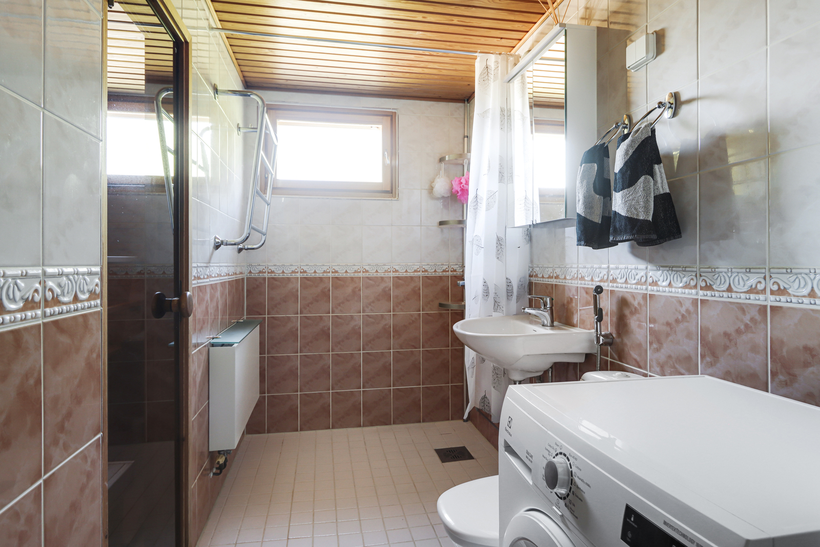 | Kylpyhuoneen kuvaus | WC-istuin, peilikaappi ja suihku, seinät (kaakeli), lattiat (laatta) |