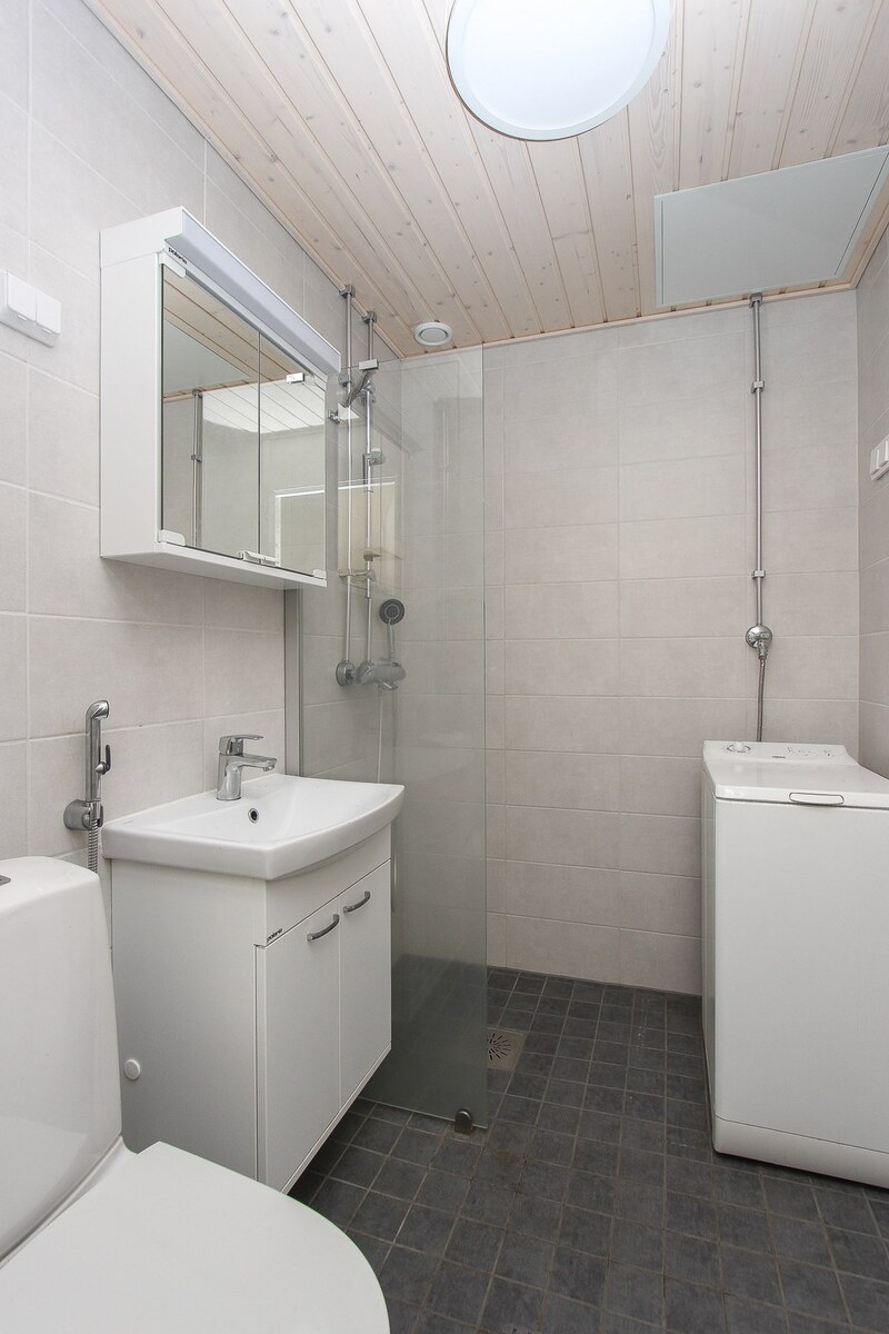 Suihku, lattialämmitys, suihkuseinä, wc-istuin ja pesukoneliitäntä, seinät (kaakeli), lattiat (laatta) |
