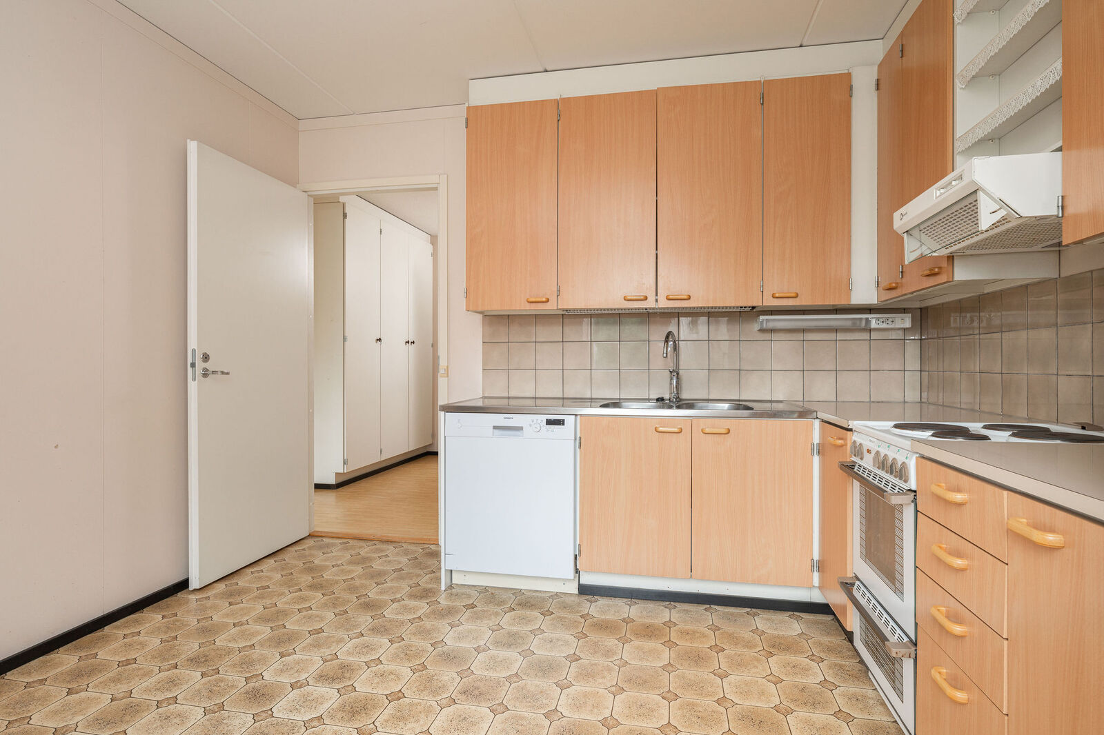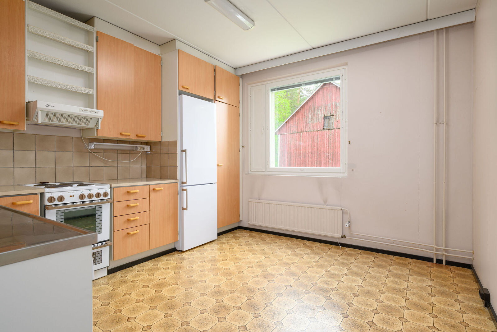 Liesi (sähköliesi), työtasot (puu), seinät (maali), lattiat (muovimatto), jääkaappipakastin, liesi ja liesituuletin / hormi |