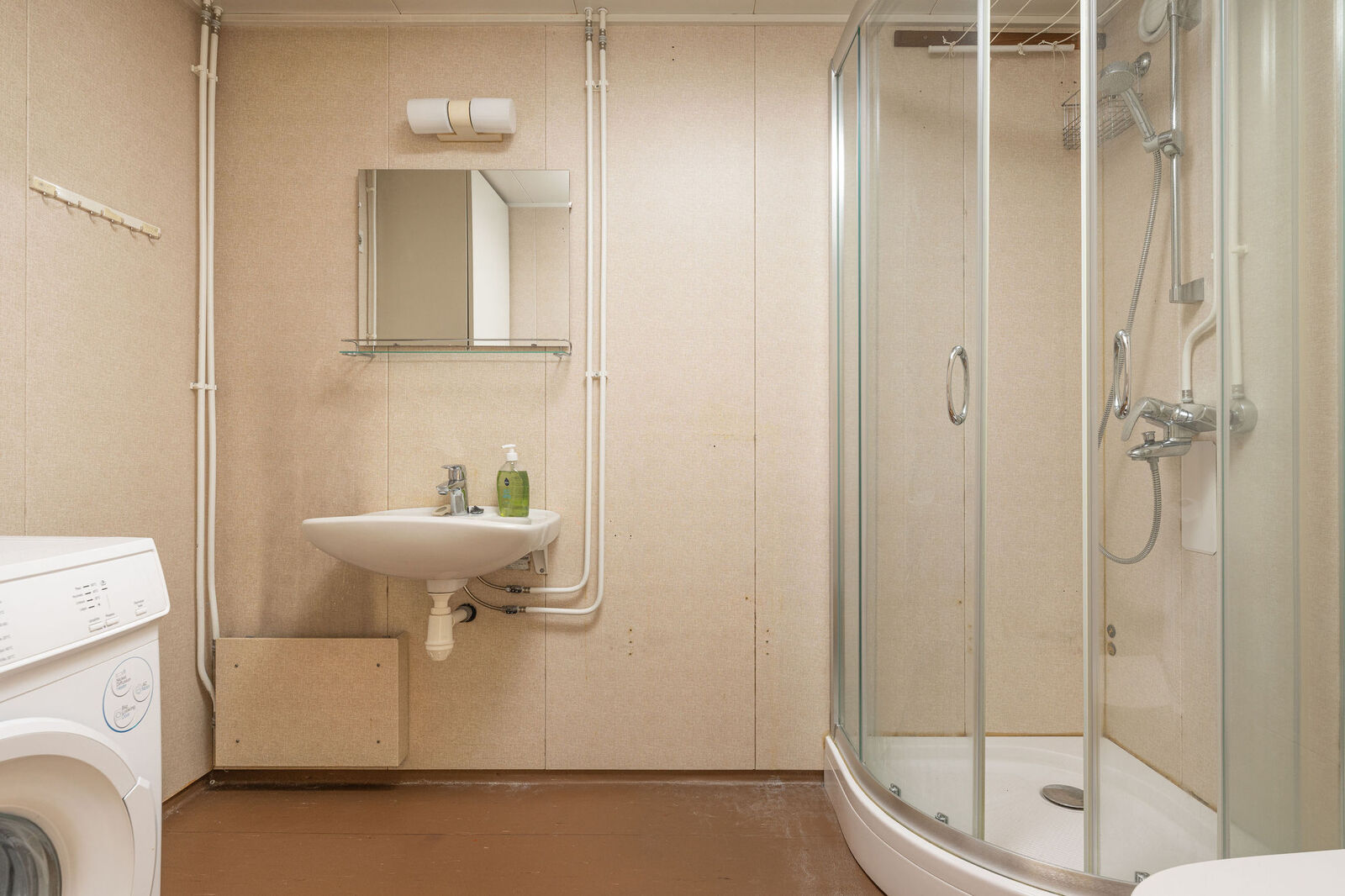 WC-istuin, suihku ja pesukoneliitäntä, seinät (tapetti), lattiat (muovimatto) |