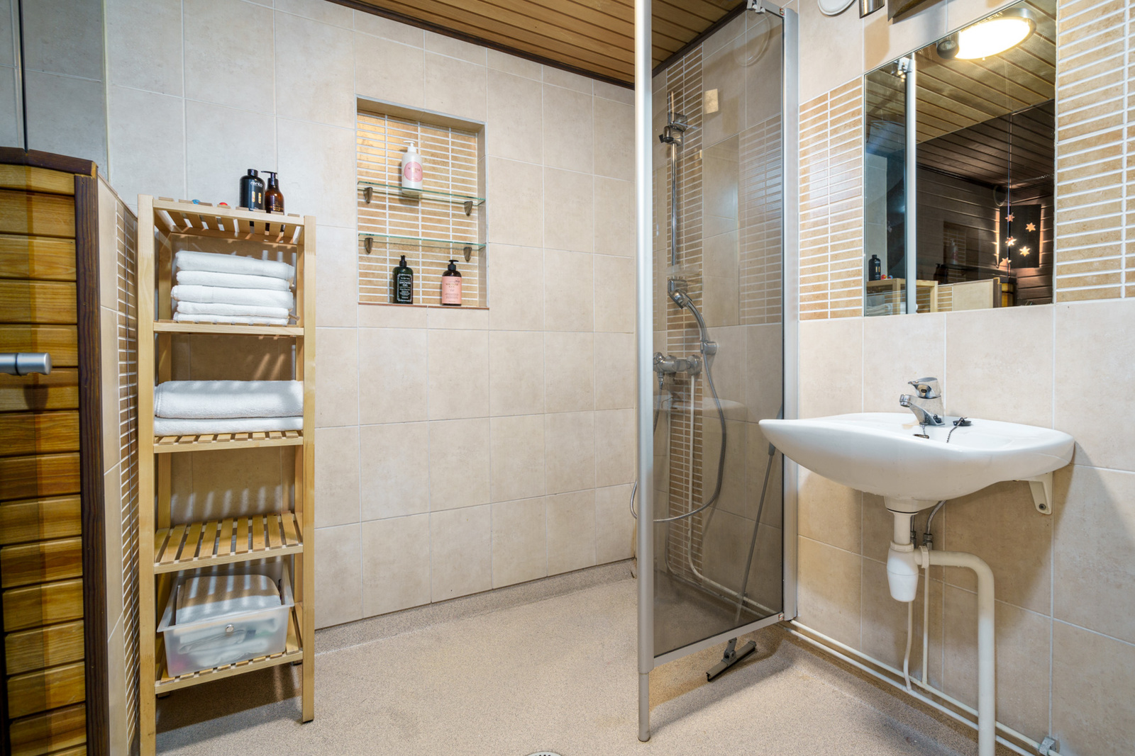 | Kylpyhuoneen kuvaus | Suihkuseinä ja suihku, seinät (kaakeli), lattiat (laatta) |