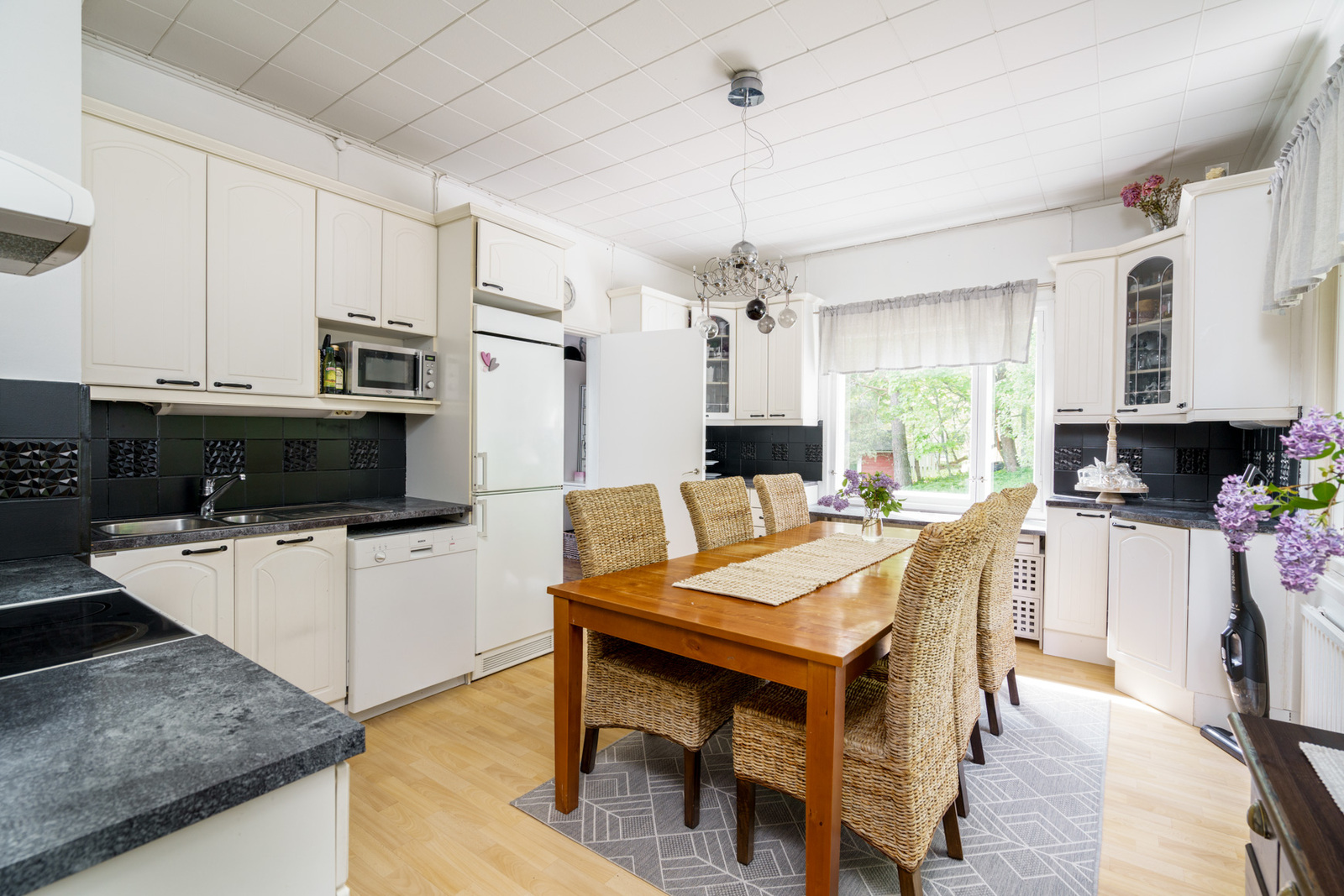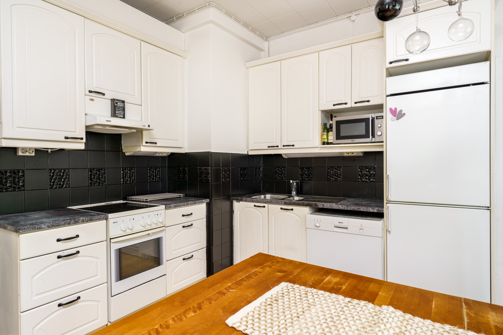 | Keittiön kuvaus | Liesi (Keraaminen liesi), työtasot (laminaatti), seinät (maali ja osalaatoitus), lattiat (muovimatto), astianpesukone, jääkaappipakastin ja liesituuletin |