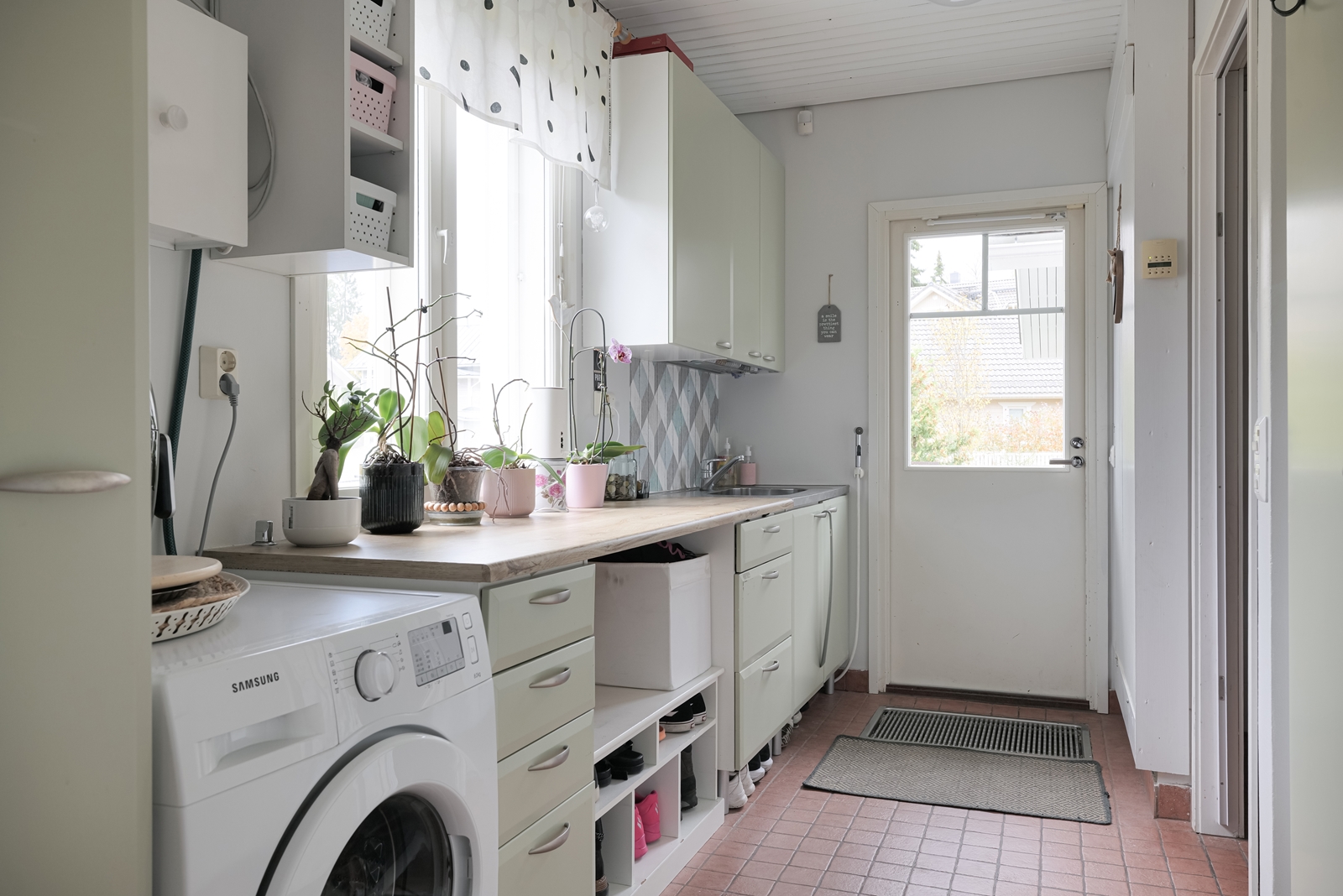 Pesukoneliitäntä, kurapiste ja keskuspölynimuri, lattiat (laatta), seinät (maali) |