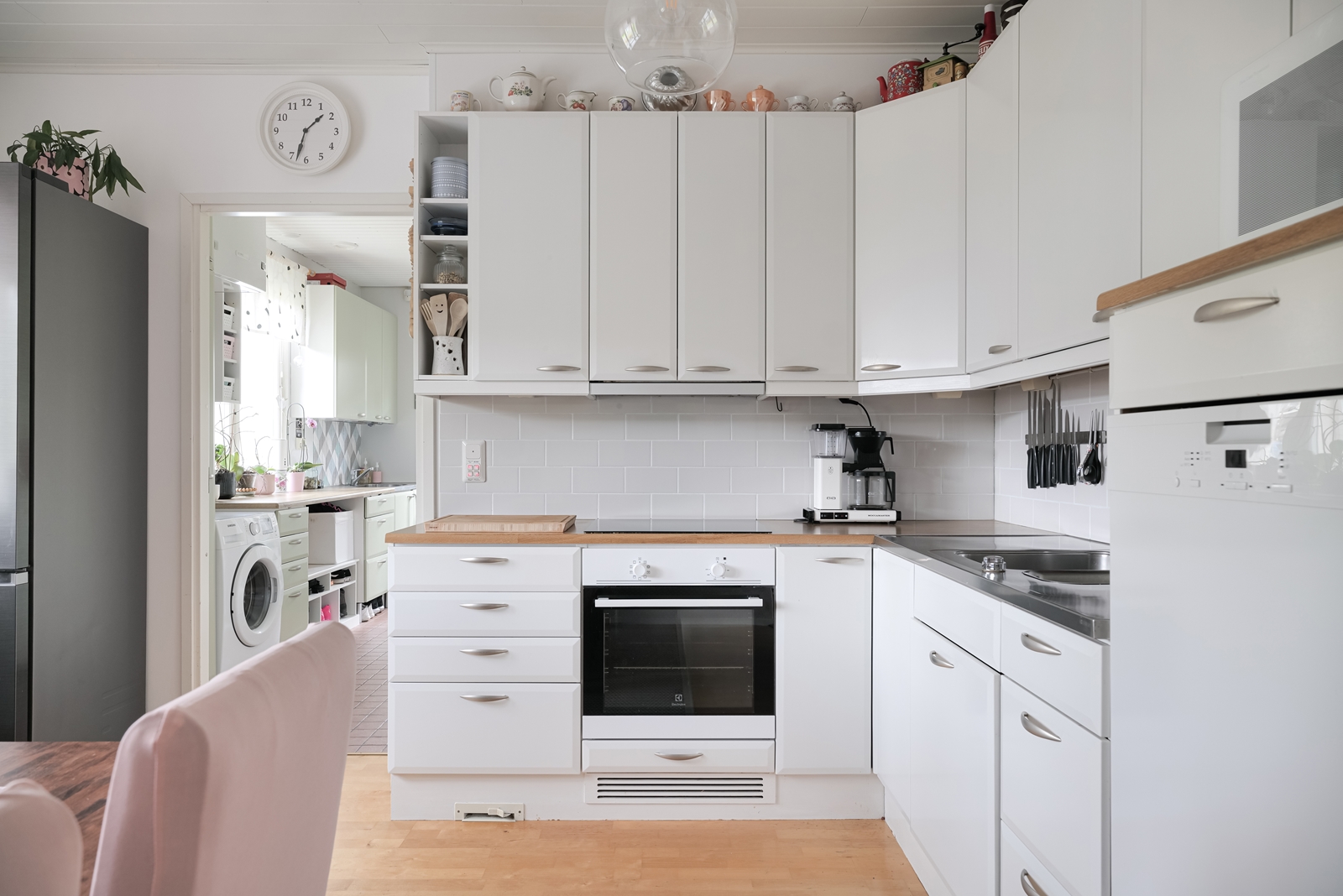 Liesi (Induktioliesi), työtasot (puu ja laminaatti), seinät (laatta, maali ja tapetti), lattiat (parketti), jääkaappipakastin, uuni, liesituuletin ja astianpesukone |
