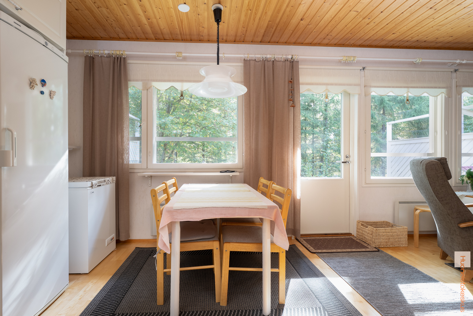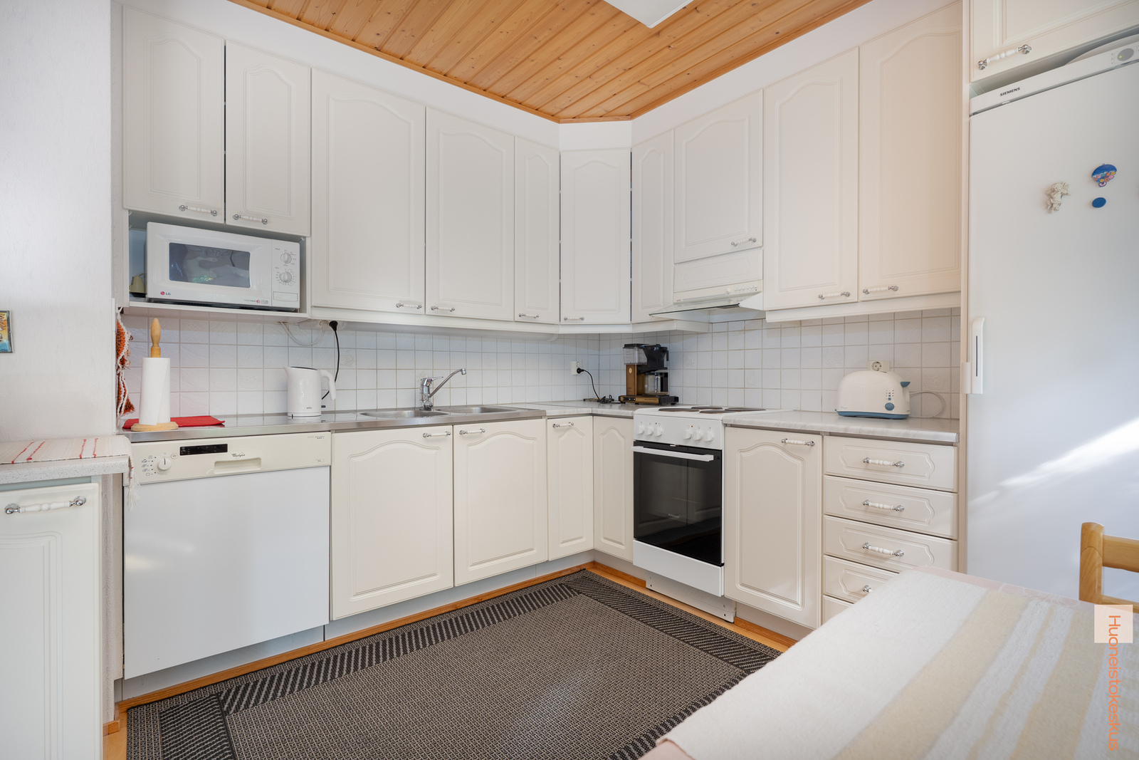 | Keittiön kuvaus | Liesi (sähköliesi), työtasot (laminaatti), seinät (maali ja osalaatoitus), lattiat (laminaatti), astianpesukone, jää-viileäkaappi, liesi ja liesituuletin / hormi |