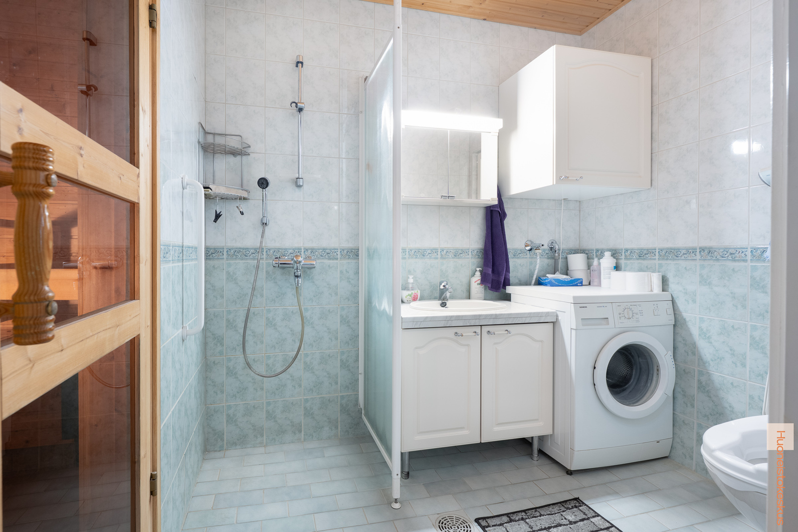 | Kylpyhuoneen kuvaus | Suihkuseinä, allaskaappi, pesukoneliitäntä, lattialämmitys ja suihku, seinät (kaakeli), lattiat (laatta) |