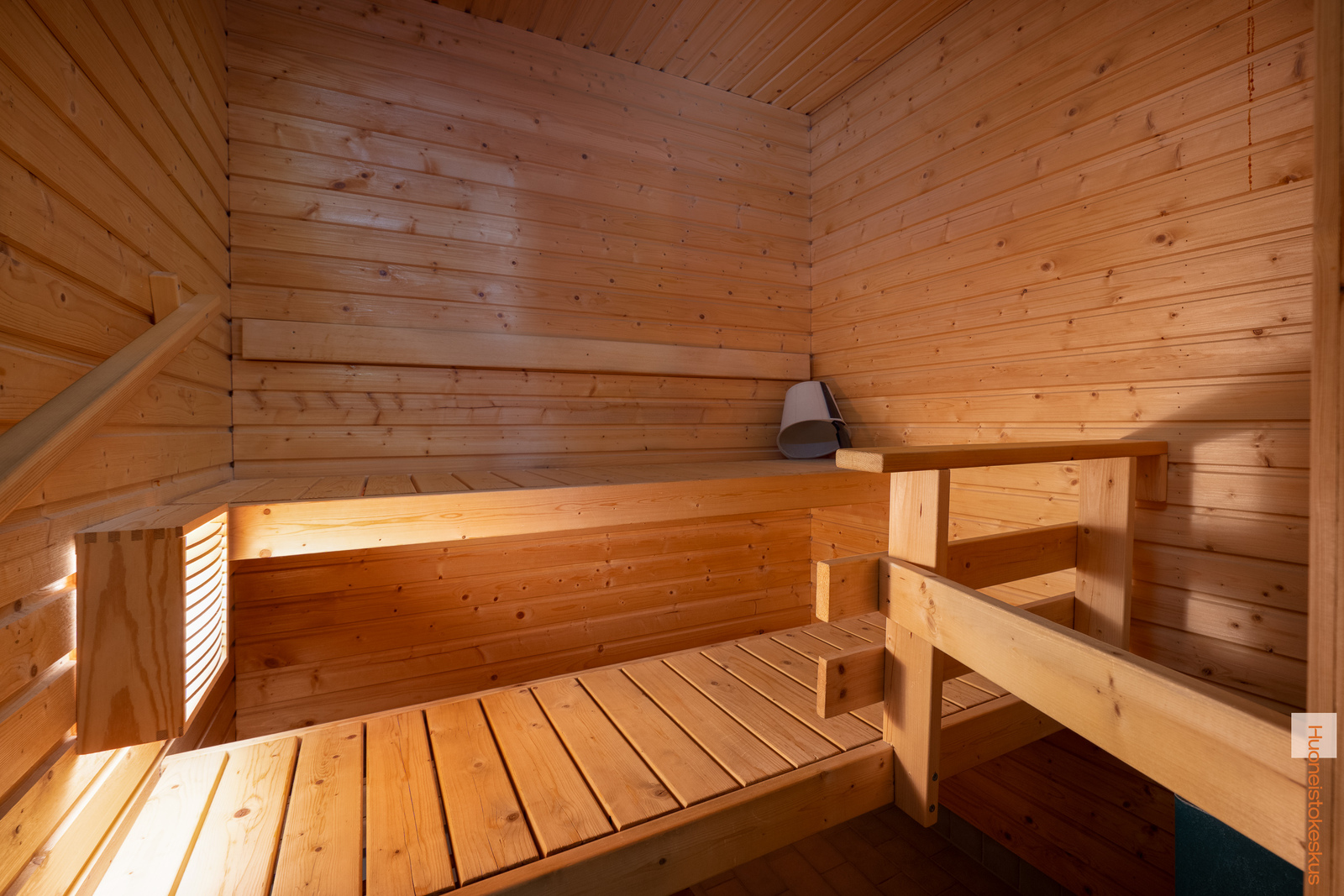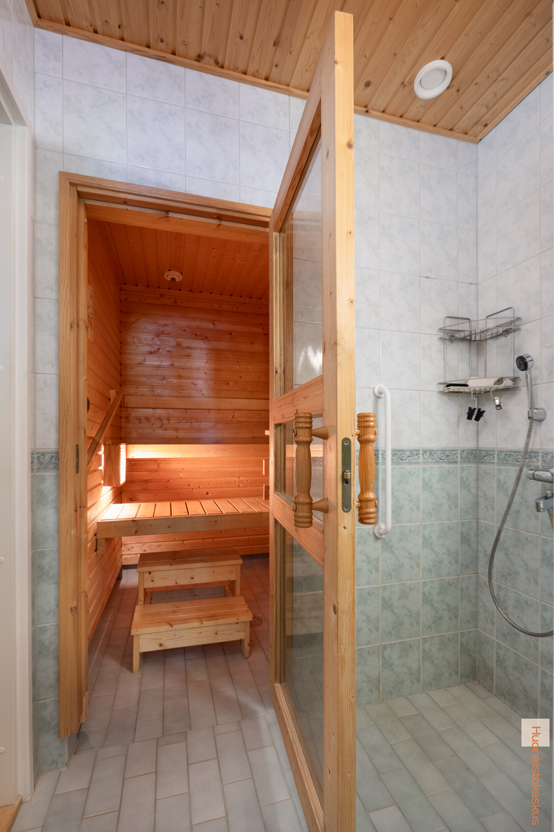 | Saunan kuvaus | Seinät (puu), lattiat (laatta), Sähkökiuas |