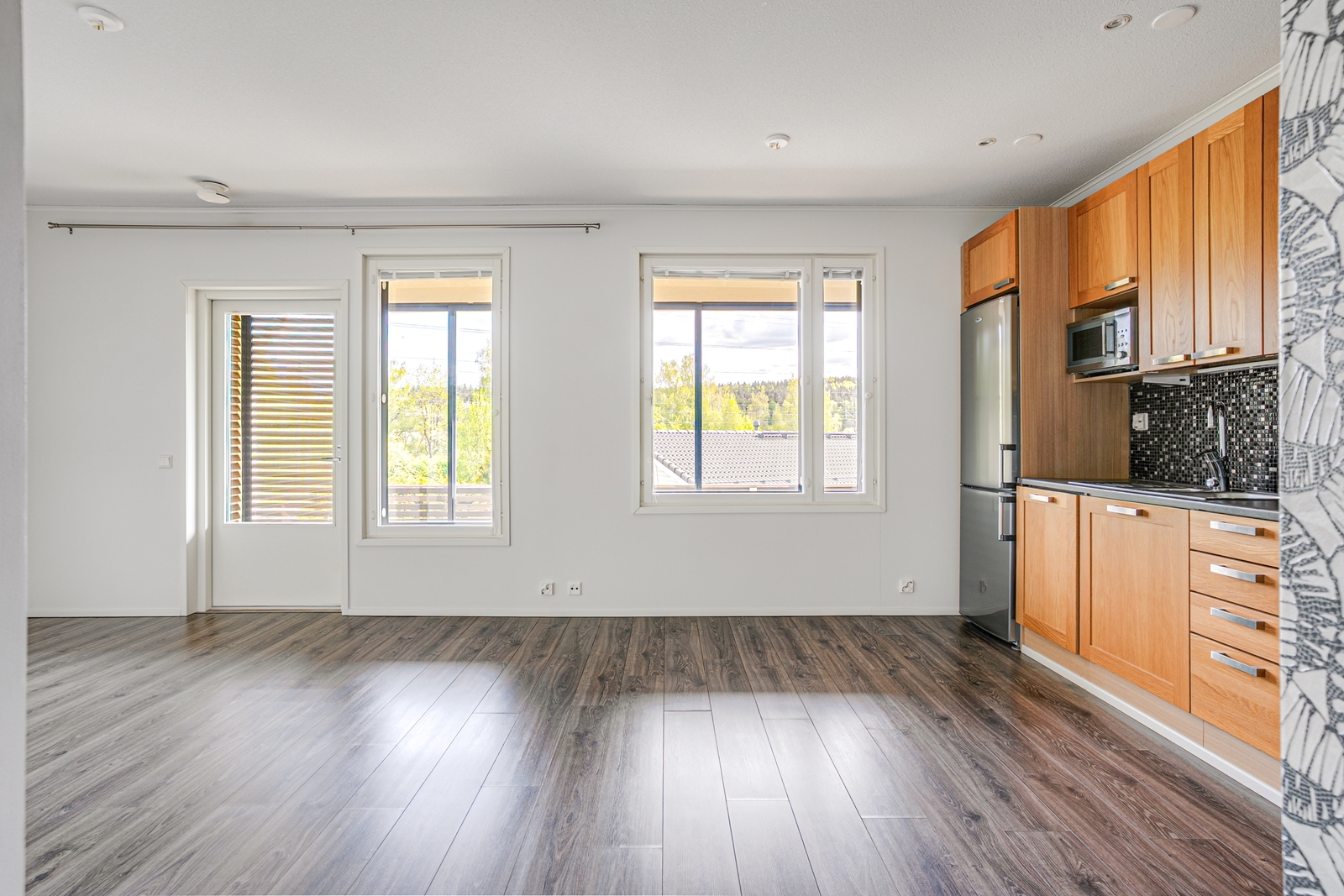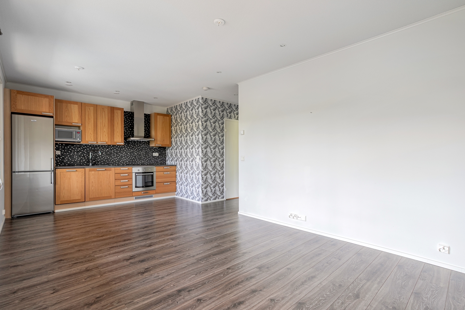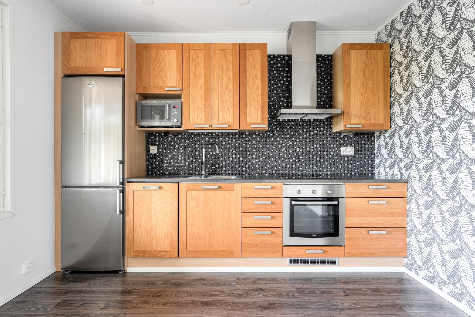 Liesi (Keraaminen liesi ja erillisuuni), seinät (tapetti ja maali), lattiat (laminaatti), liesituuletin, erillisuuni, astianpesukone, jääkaappipakastin, mikroaaltouuni ja kiinteät valaisimet |