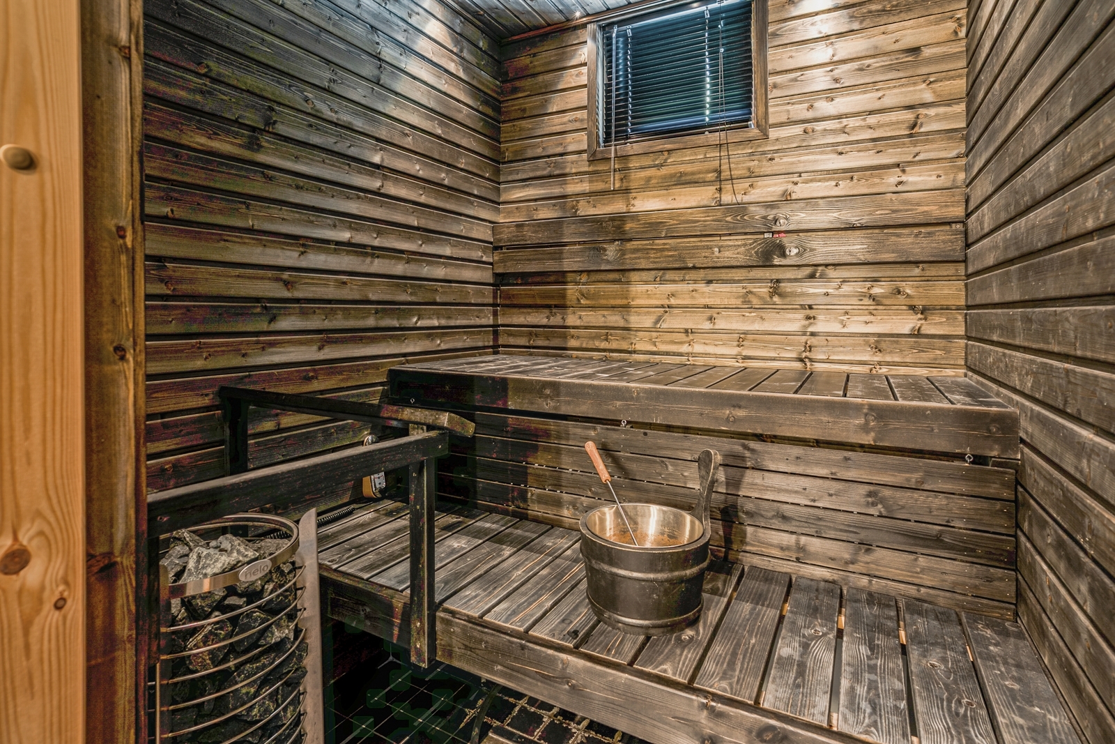 Seinät (kaakeli), lattiat (laatta), Sähkökiuas, ikkuna |