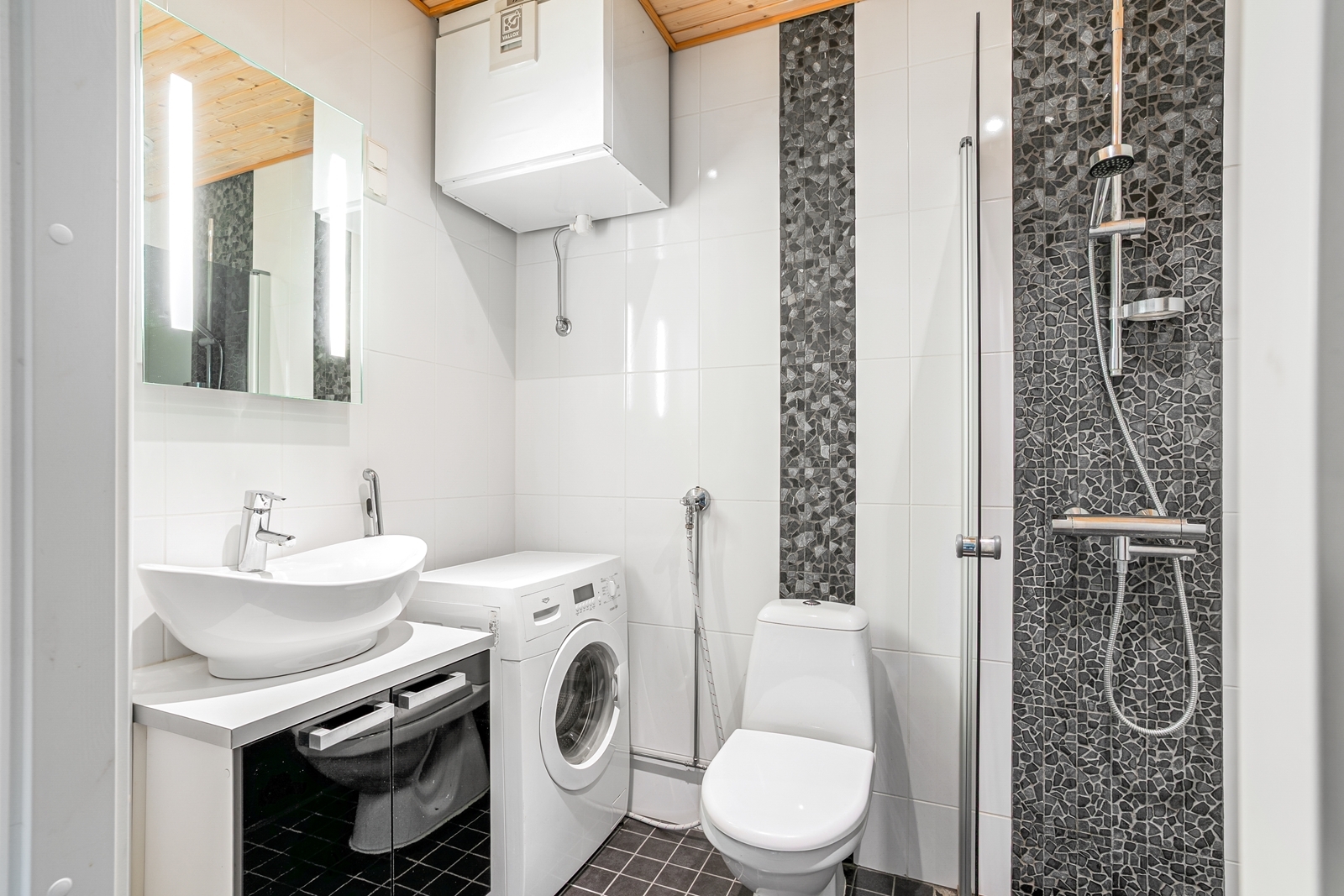 Pesukoneliitäntä, suihkuseinä, wc-istuin, allaskaappi, peili, lattialämmitys, pesukone ja suihku, seinät (kaakeli), lattiat (laatta) |