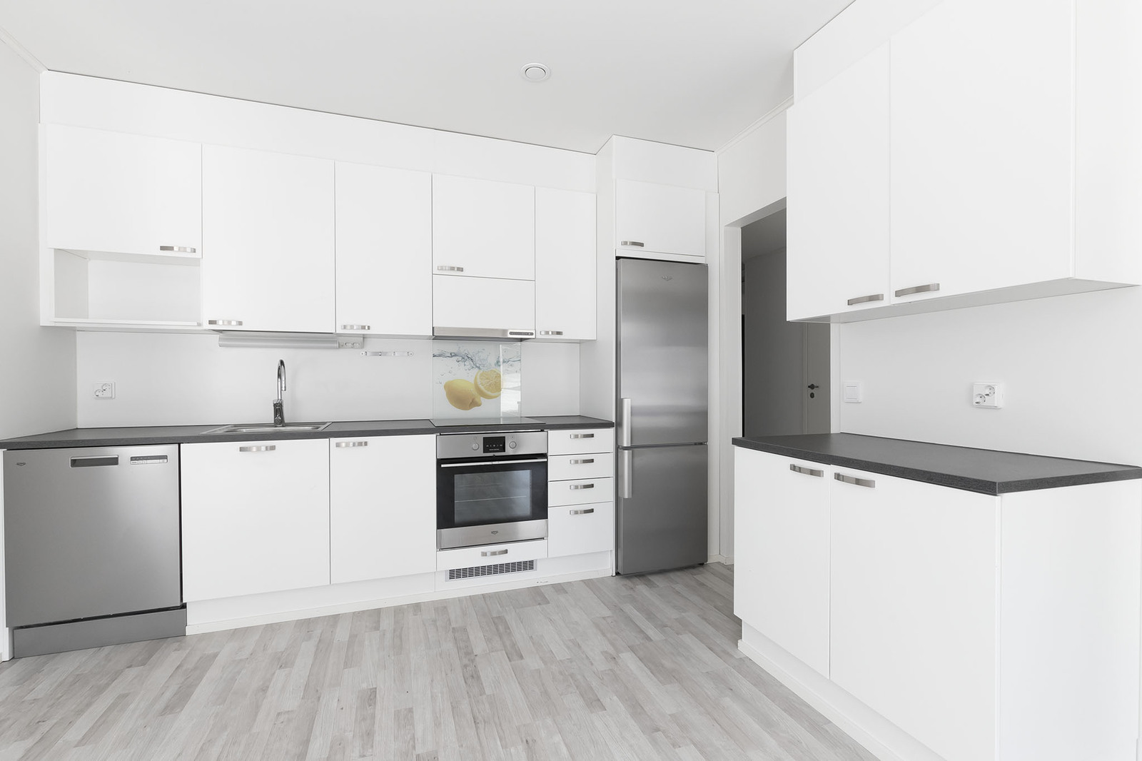 | Keittiön kuvaus | Liesi (erillisuuni, liesitaso), seinät (maali), lattiat (laminaatti), astianpesukone, erillisuuni, jääkaappipakastin ja kiinteät valaisimet, liesitaso, liesituuletin / hormi |
