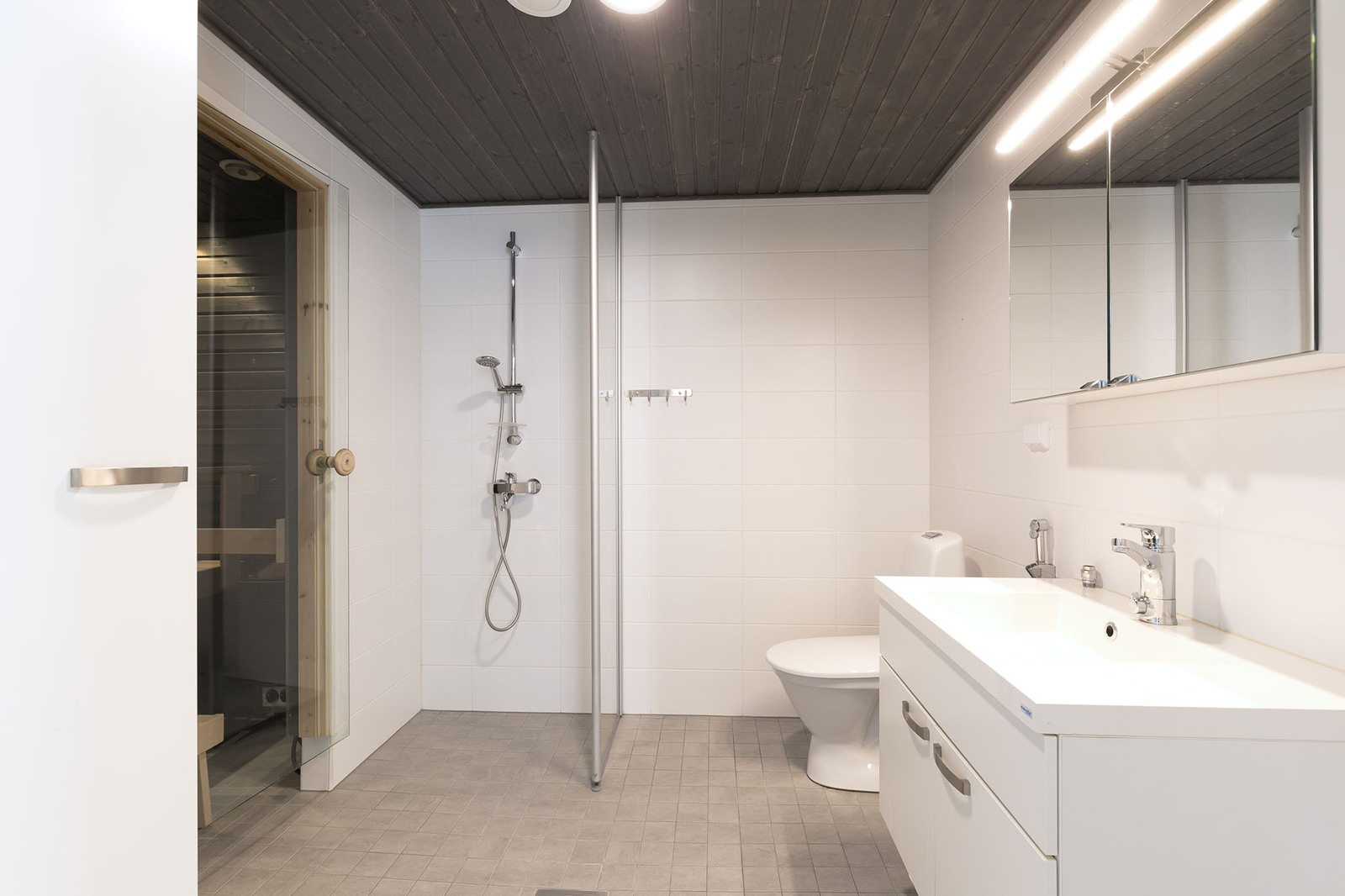 | Kylpyhuoneen kuvaus | Allaskaappi, lattialämmitys, peilikaappi, suihku, pesukoneliitäntä, suihkuseinä, wc-istuin ja kiinteät valaisimet, seinät (maali), lattiat (laatta) |