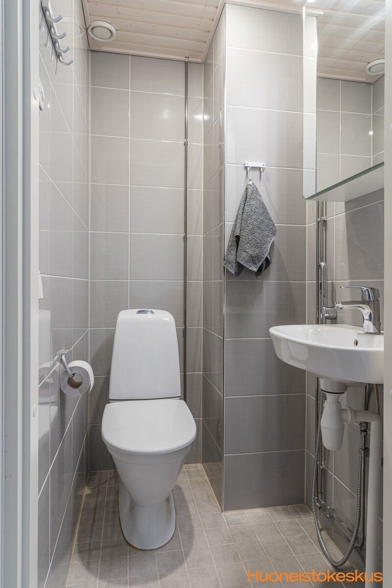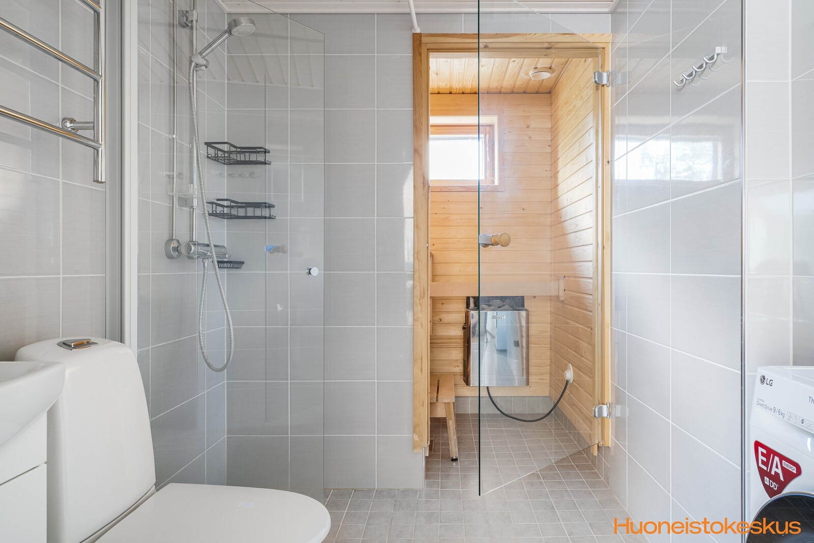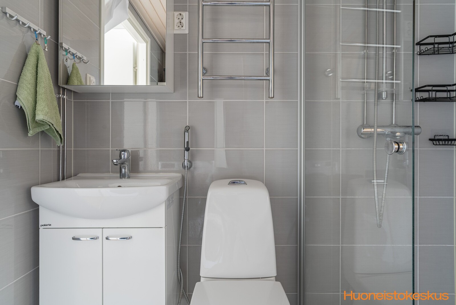 | Kylpyhuoneen kuvaus | Suihkuseinä, pesukoneliitäntä, wc-istuin, peilikaappi, suihku, allaskaappi, lattialämmitys ja kiinteät valaisimet, seinät (kaakeli) |