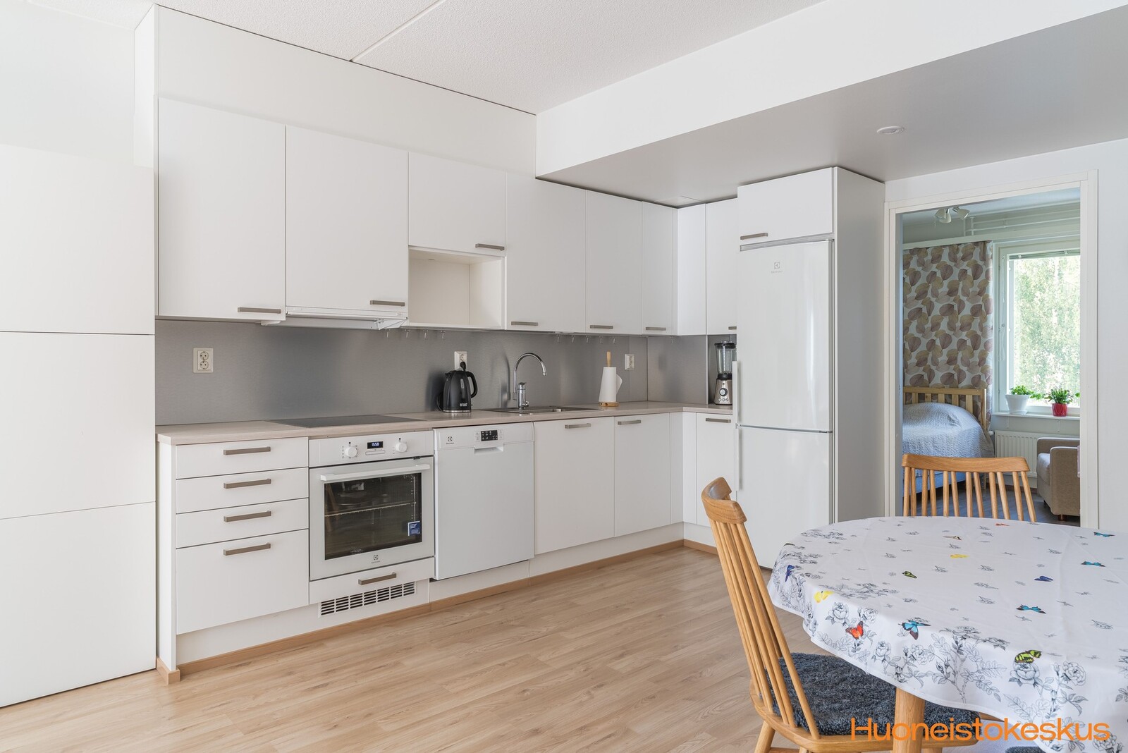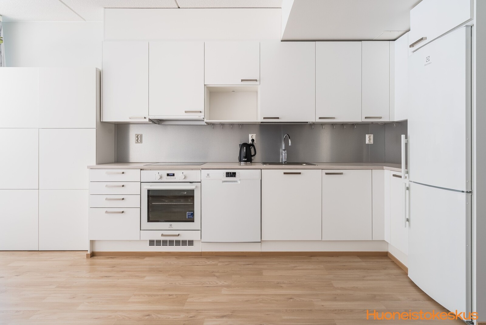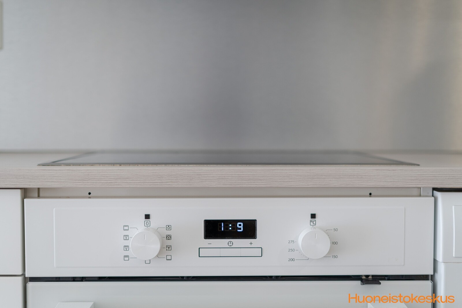 | Keittiön kuvaus | Liesi (integroitu), työtasot (laminaatti), seinät (maali), lattiat (laminaatti), astianpesukone, jääkaappipakastin ja kiinteät valaisimet, liesituuletin / hormi |