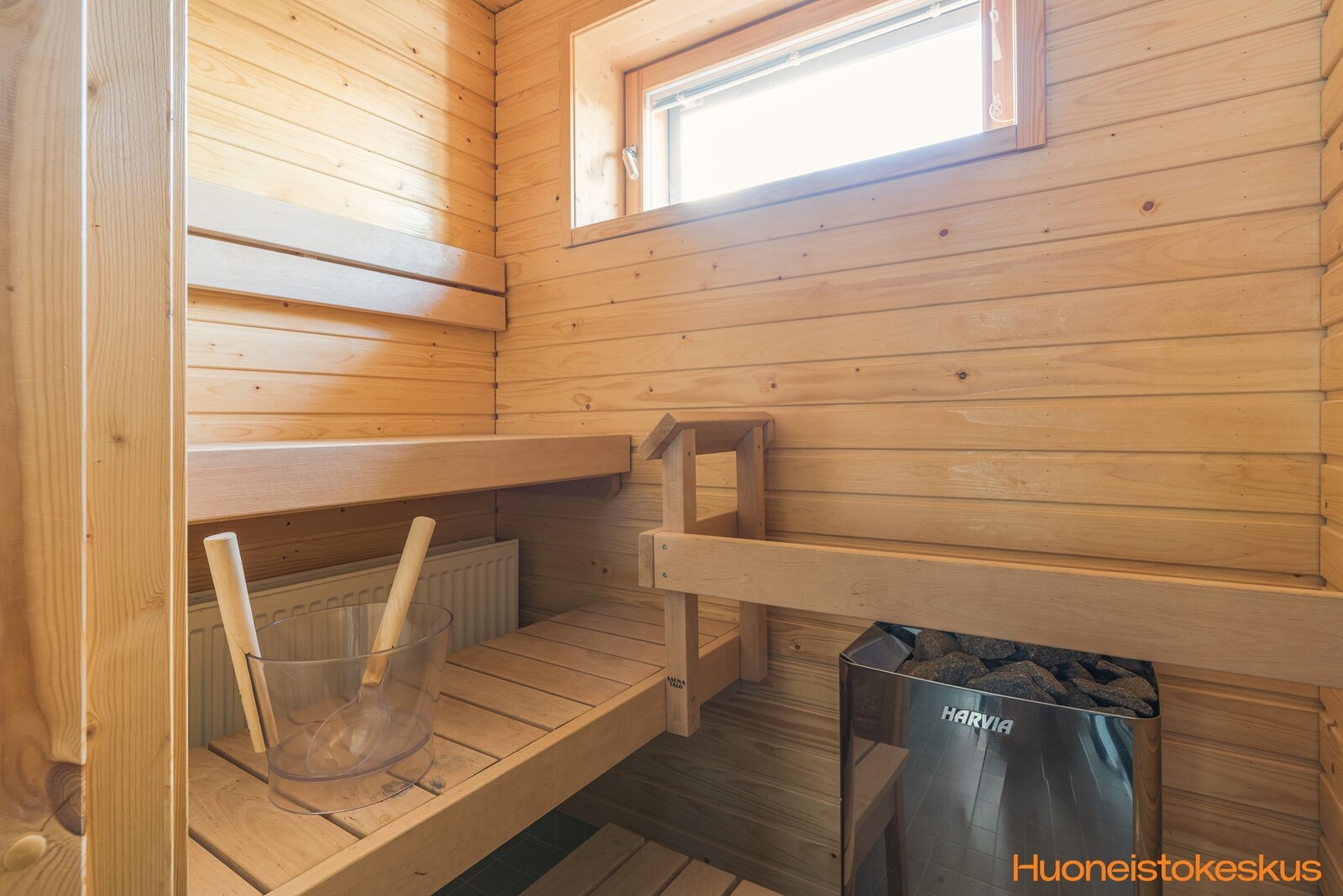 | Saunan kuvaus | Seinät (kaakeli), lattiat (laatta), Sähkökiuas, Saunassa ikkuna |
