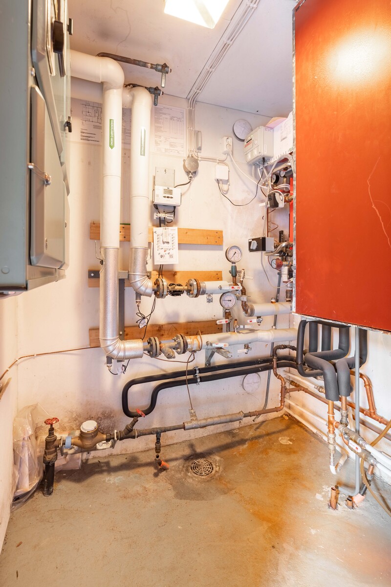 Lämmityksen hoitaa kaukolämpö, ilmalämpöpumppu ja olohuoneen varaava takka.