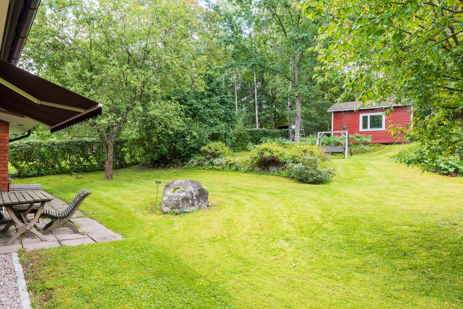 Myös autotalli ja varasto ovat lämpimiä. Suurella vehreällä pihalla terassit sekä idyllinen pihamökki.