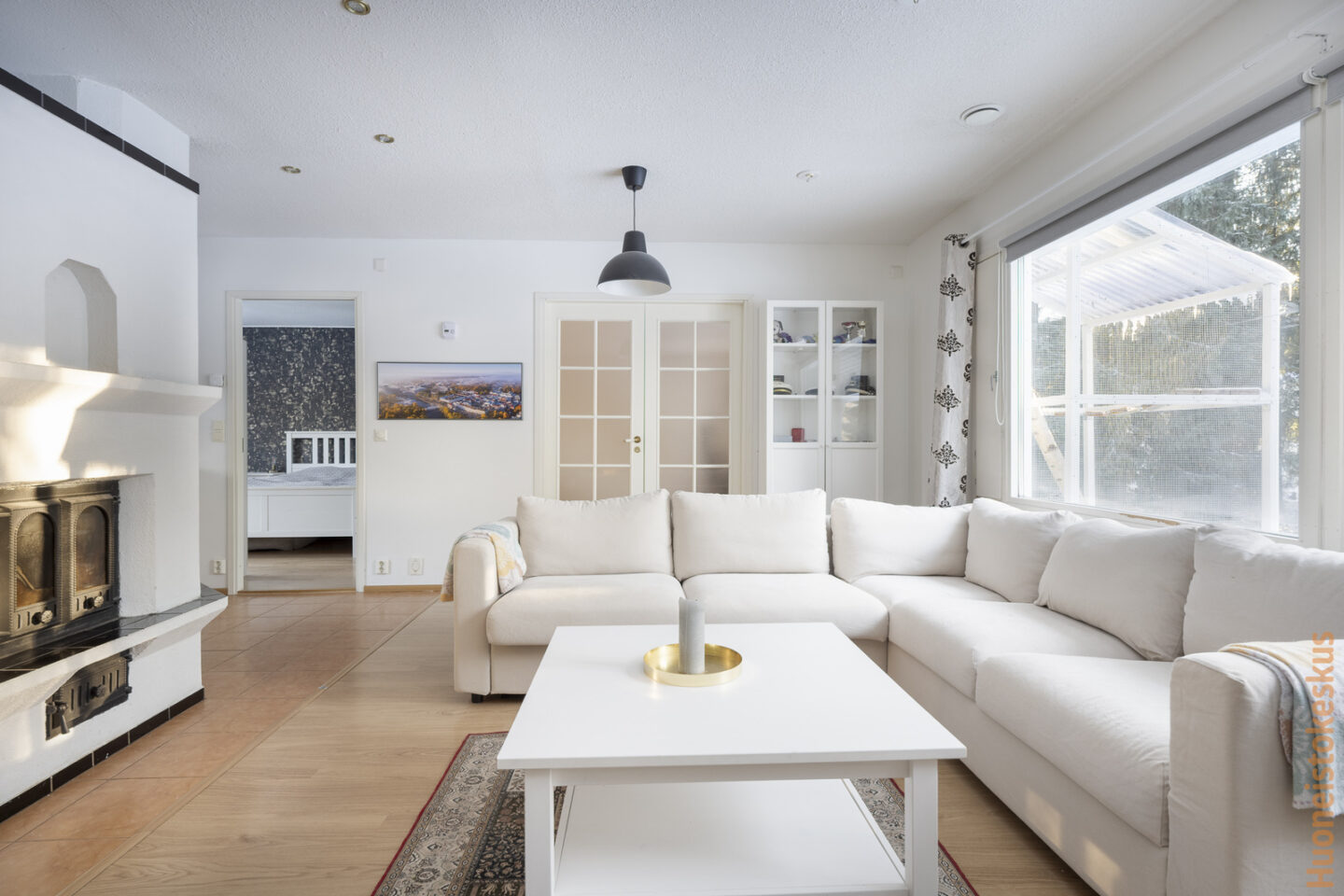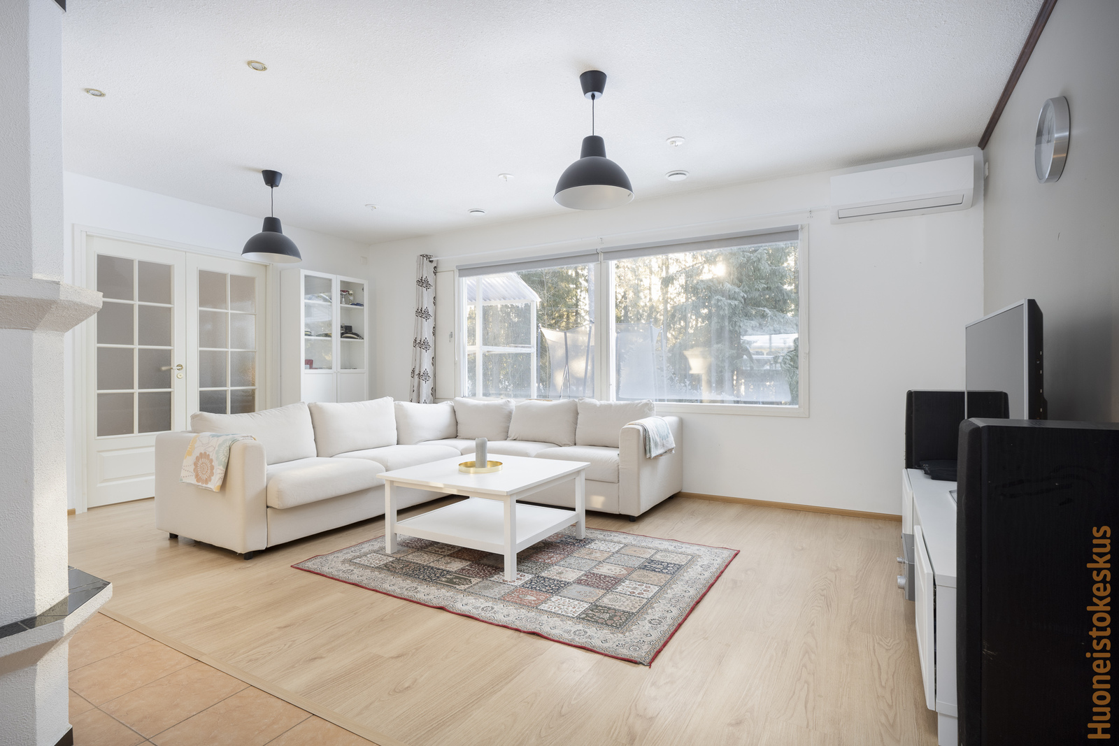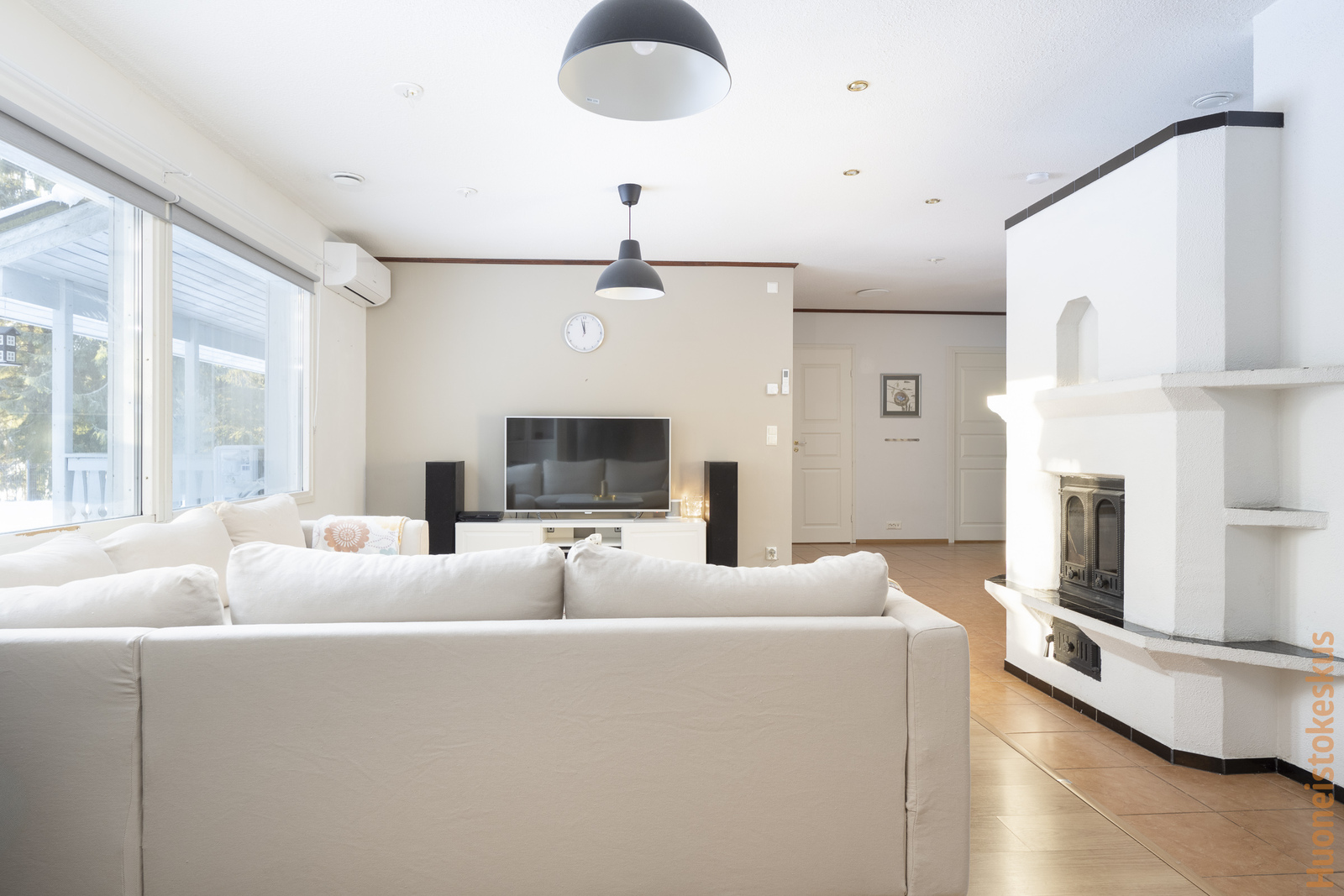 Tässä kodissa makuuhuoneita on kolme. Olohuone / keittiö on valoisaa ja avaraa tilaa, jossa varaava takka toimii tilanjakajana. Kodinhoitohuoneesta on käynti katetulle terassille ja takapihalle. Pesuhuoneen yhteydessä on kaksi saunaa, perinteinen sähkösauna ja ekstrana on höyrysauna.