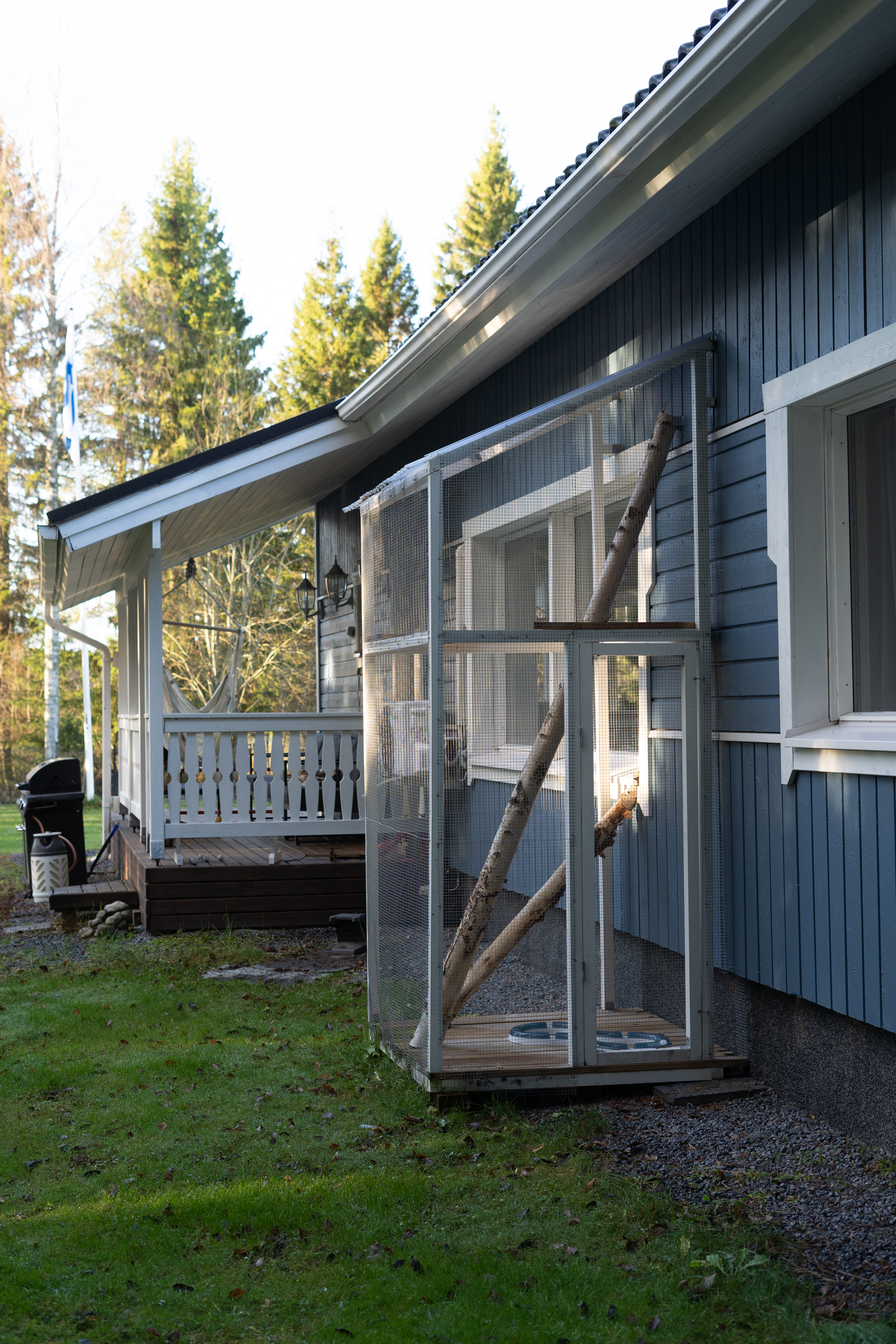 | Muuta kauppaan kuuluvaa | Lipputanko, pihavalot. Kissanhäkki (takapihalla). Lisätietoja sisältyvistä varusteista: ilmalämpöpumppu (viilennykseen), istutukset, jätesäiliö, kaapistot, keskuspölynimuri, kiinteät valaisimet, sälekaihtimet/rullaverhot, verhotangot., (Kauppaan ei kuulu: Robottiruohonleikkuri (voi neuvotella).) |