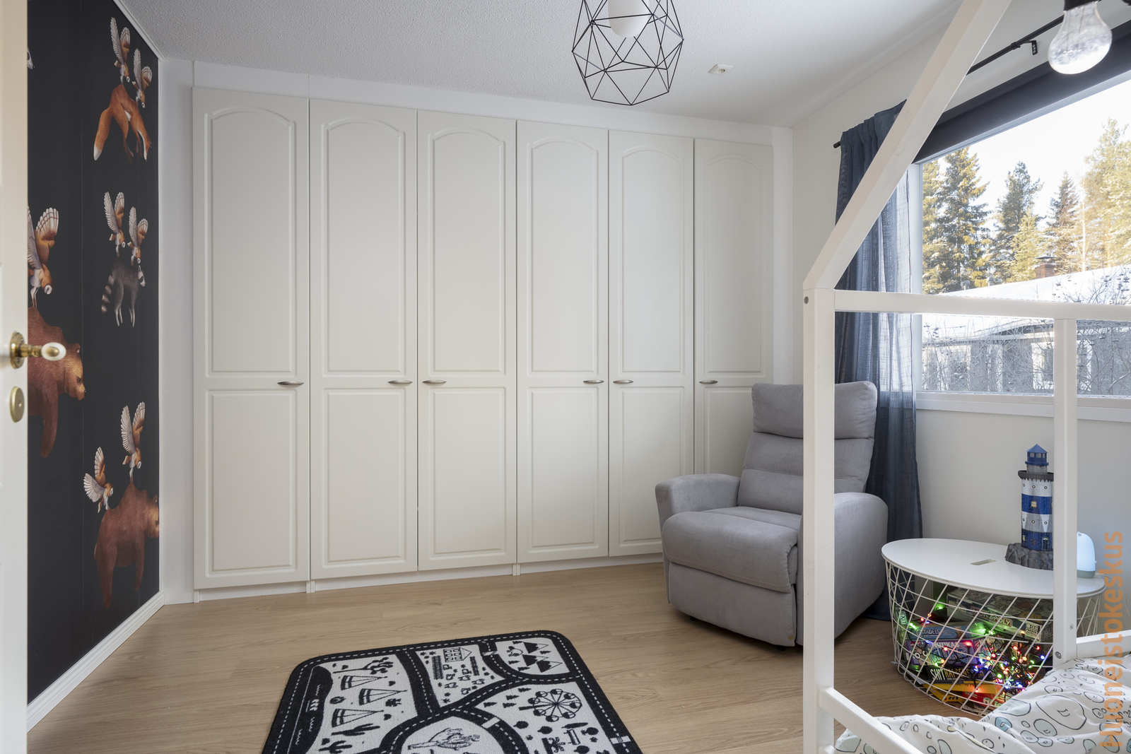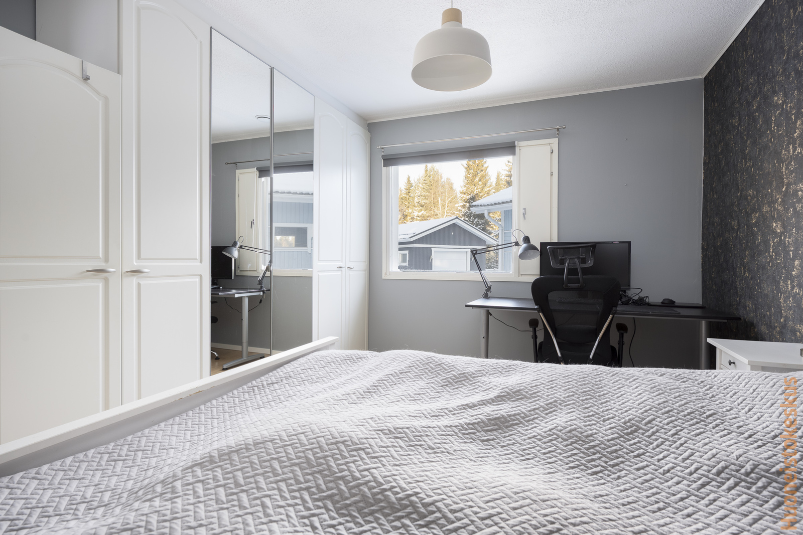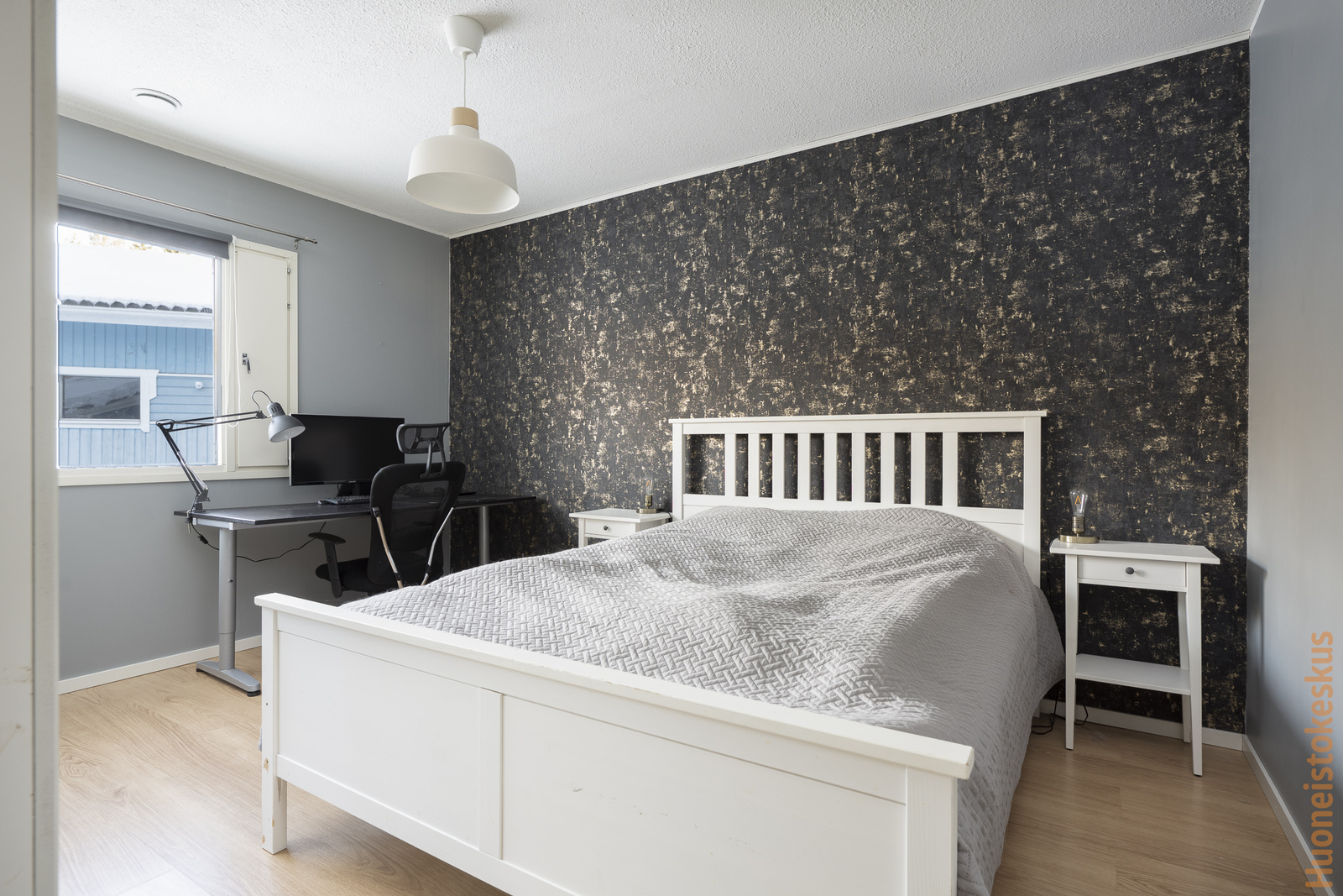 | Makuuhuoneen kuvaus | Lukumäärä: 3, seinät (tapetti ja maali), lattiat (laminaatti) |