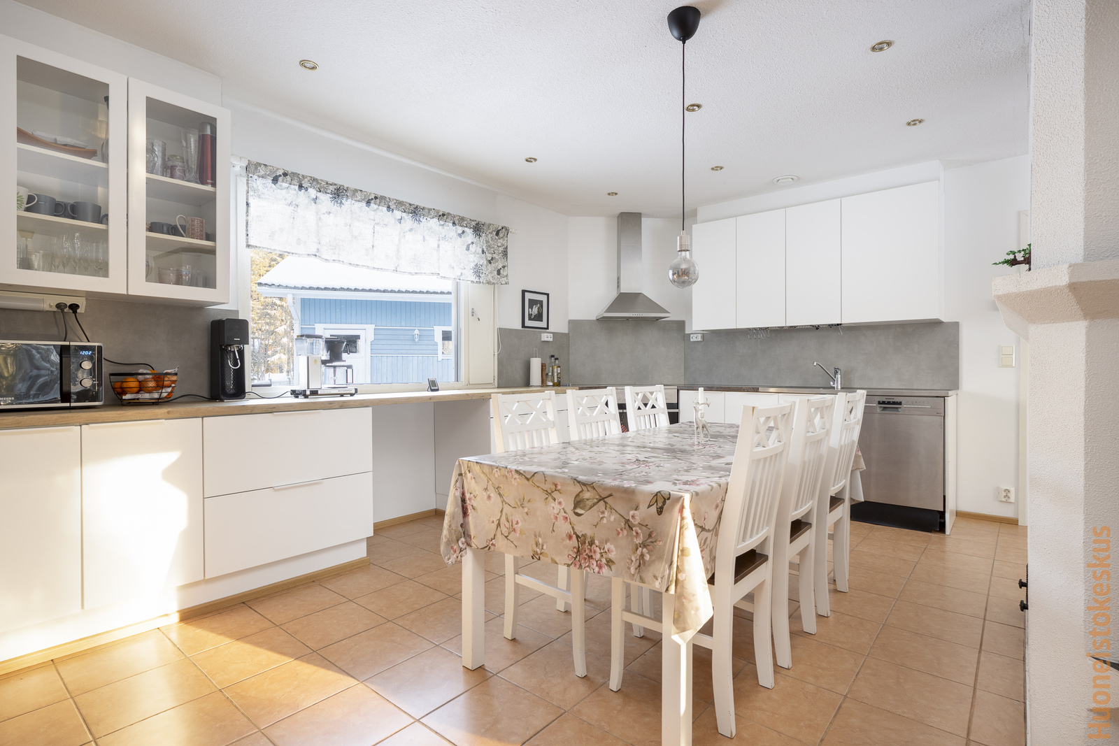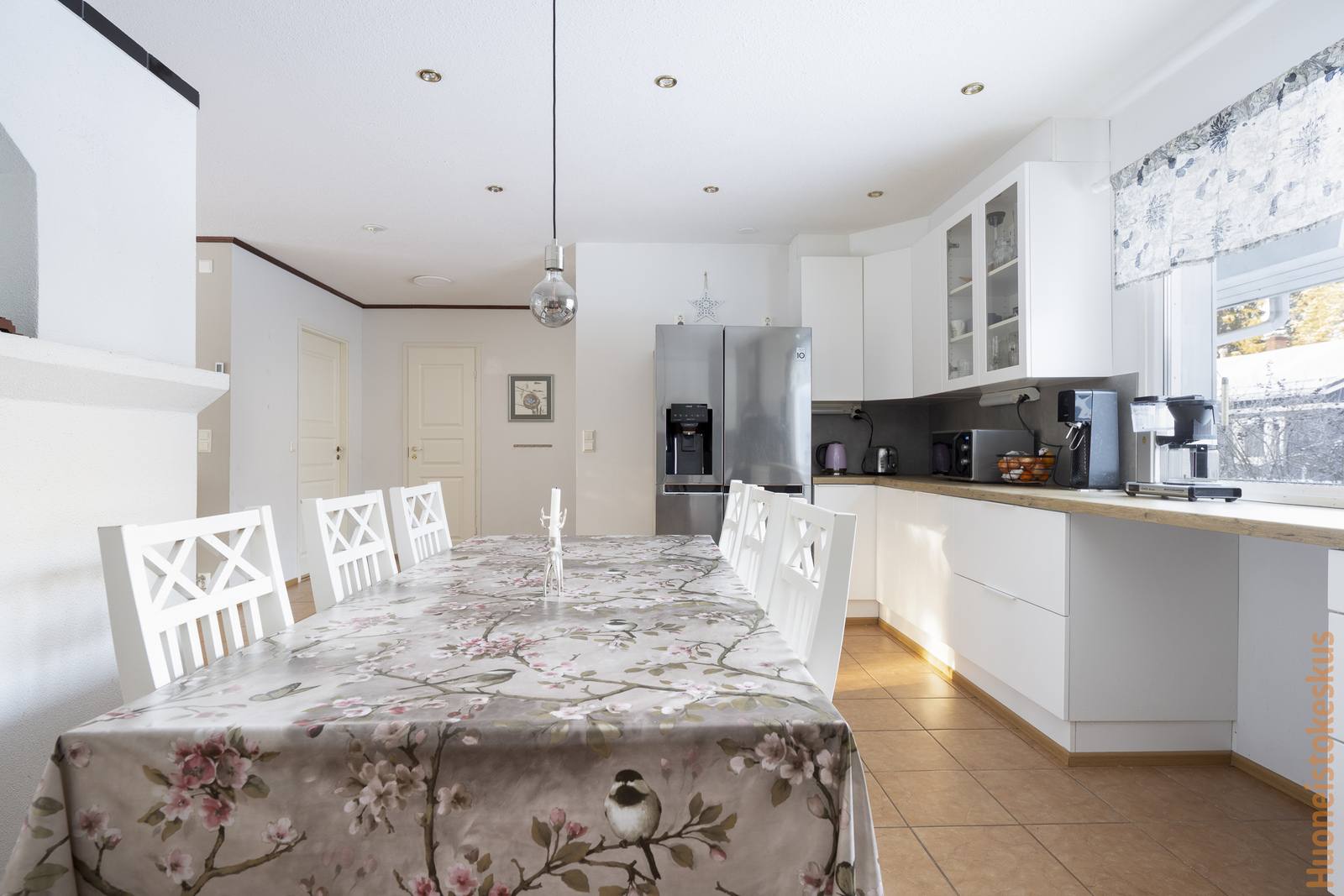 | Keittiön kuvaus | Liesi (Keraaminen liesi), työtasot (laminaatti ja kivi), seinät (maali), lattiat (laatta), astianpesukone, liesituuletin, jääkaappi, erillinen pakastin, liesi ja kiinteät valaisimet |