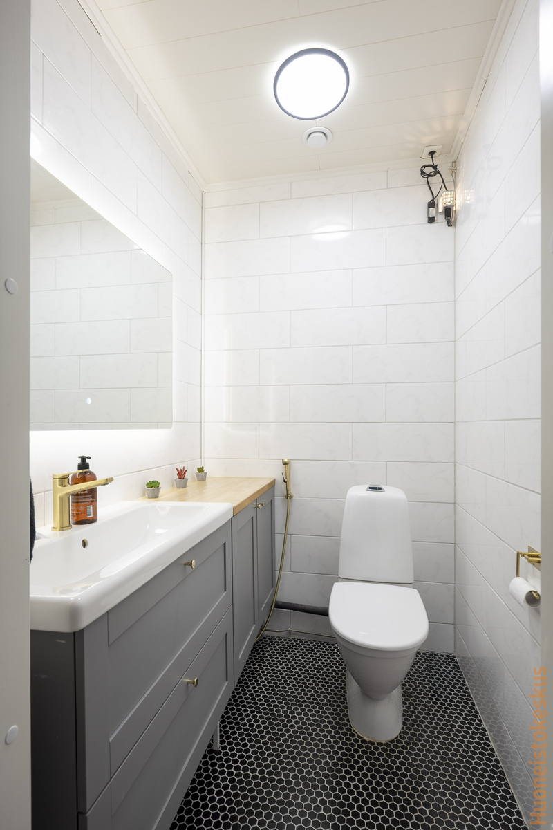 | Kylpyhuoneen kuvaus | Lattialämmitys, wc-istuin, suihku, peili, pesuallas ja kiinteät valaisimet, seinät (kaakeli), lattiat (laatta) |