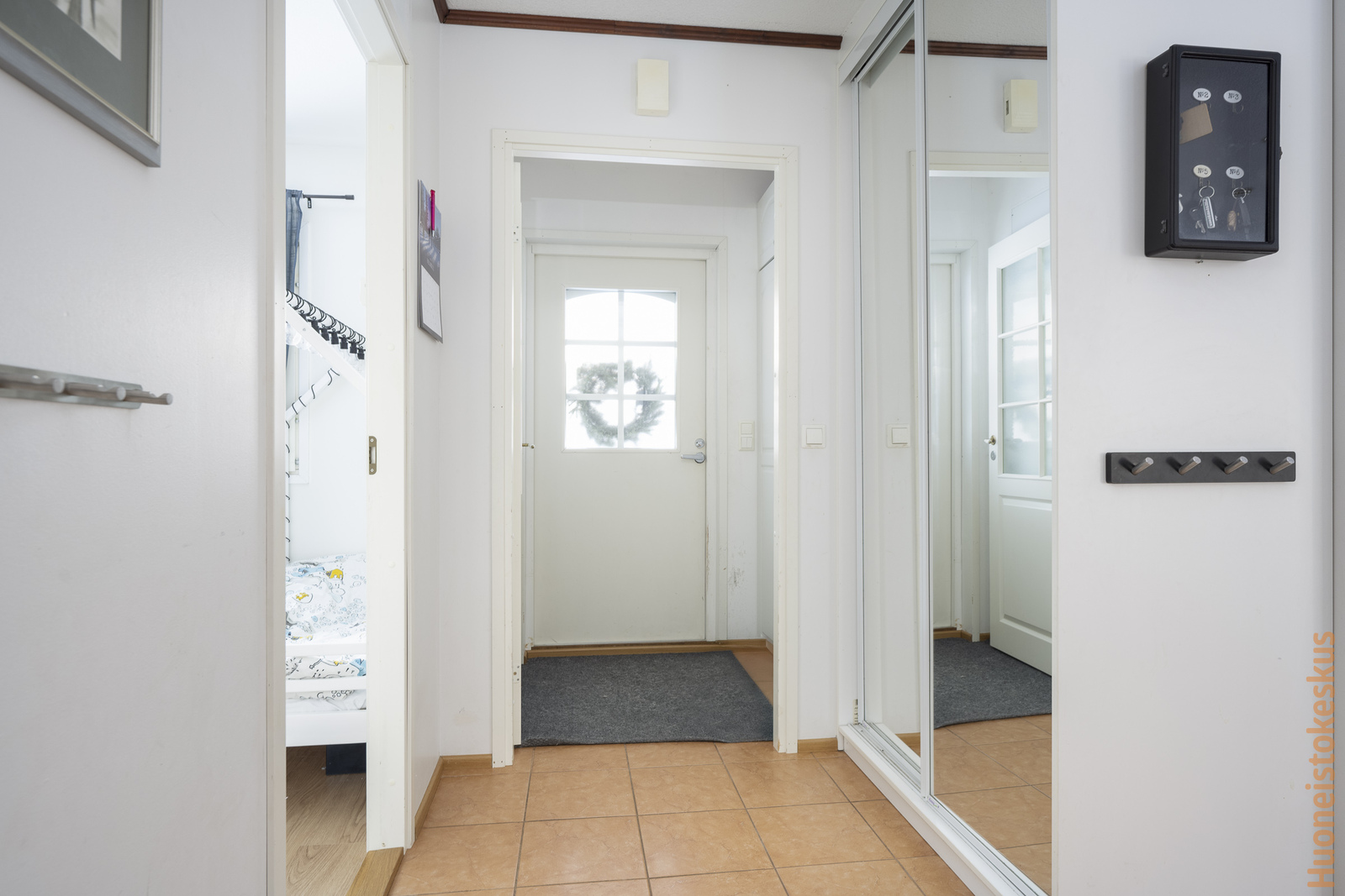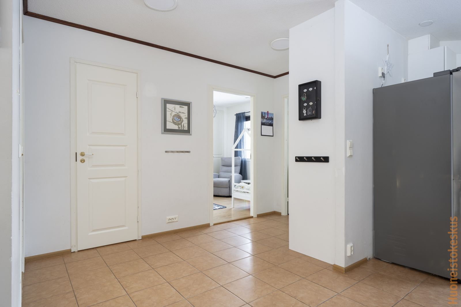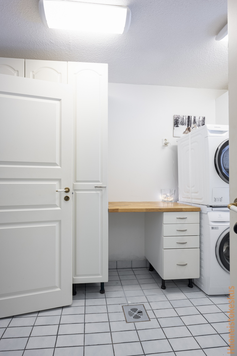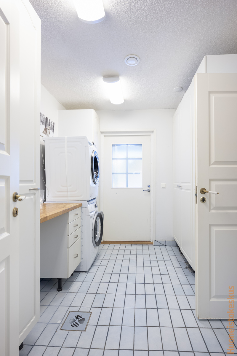 | Kodinhoitohuoneen kuvaus | Pesukoneliitäntä, keskuspölynimuri, lattiakaivo, pöytätaso, lattialämmitys, pyykkikaapit ja tila pesutornille, lattiat (laatta), seinät (maali) |