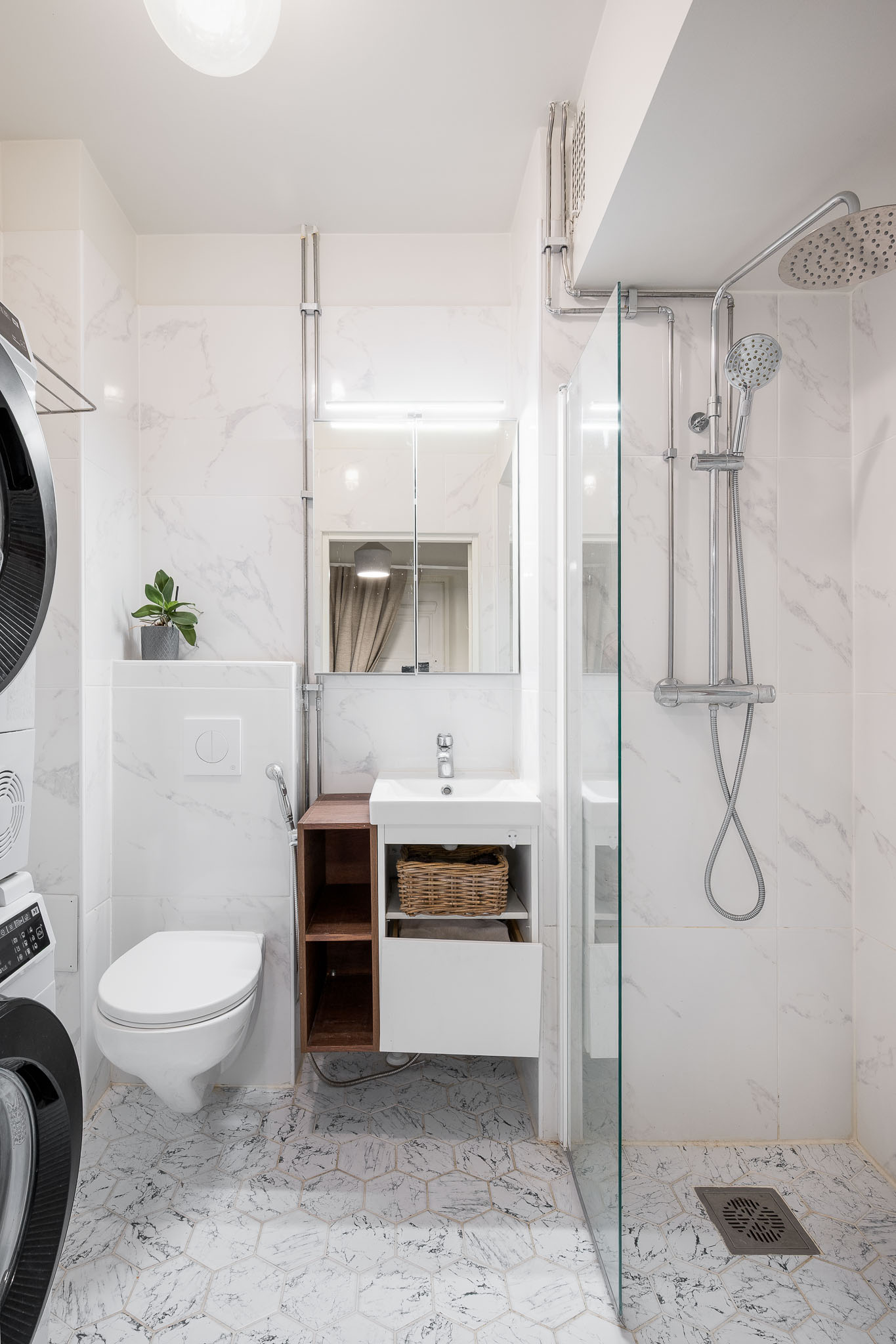 WC-istuin (seinämallinen), suihkukaappi, peilikaappi, allaskaappi ja pesuallas, seinät (kaakeli), lattiat (laatta) |