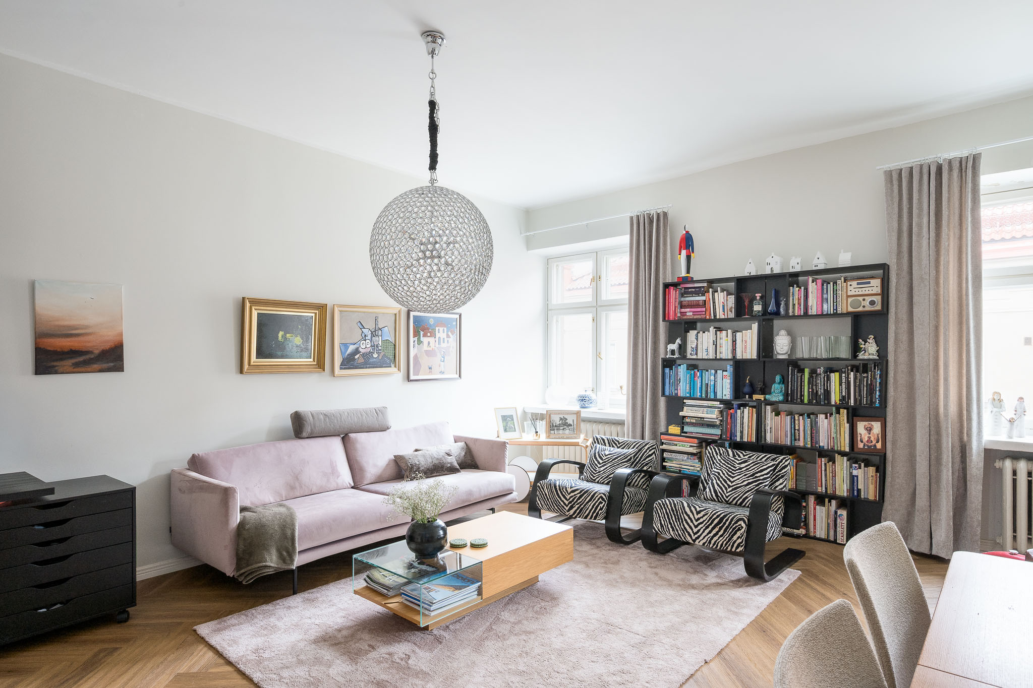 Upea tilava ja valoisa olohuone, josta ikkunat katselevat Tarkk’ampujankadun suuntaan.