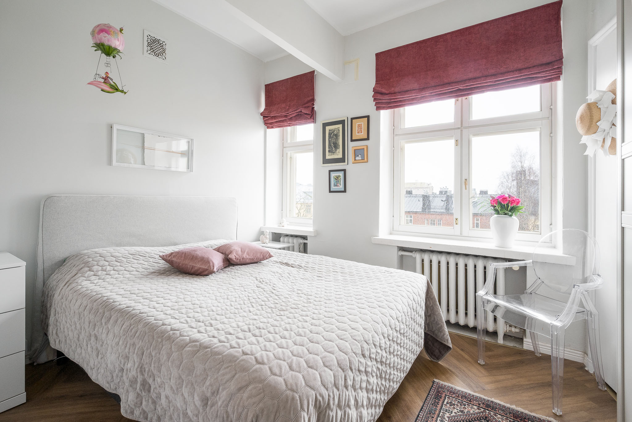 Lukumäärä: 1, Huoneistolla on viihtyisä ja rauhallinen yhtiön sisäpihan suuntaan katseleva makuuhuone. Makuuhuoneen ja kylpyhuoneen välisessä seinässä on kaunis lasinen pikkuikkuna, joka on peräisin turkulaisesta “Enkeliravintolasta”. Lattia on vinyylilankkua, ja seinät maalattu. |
