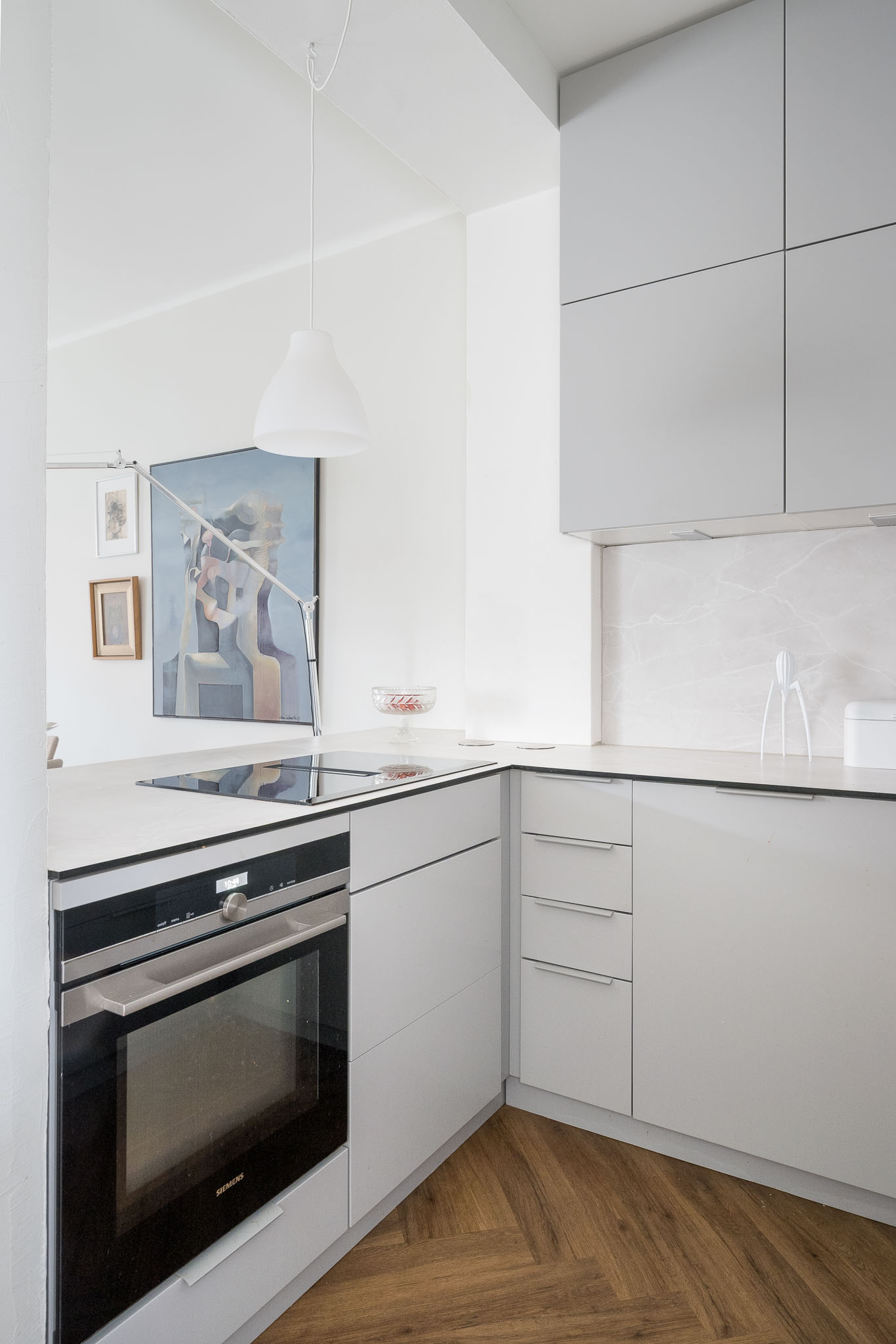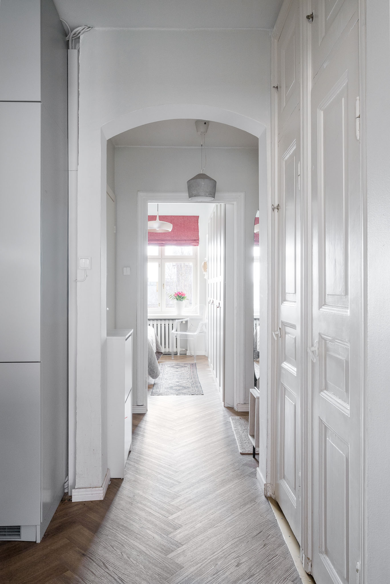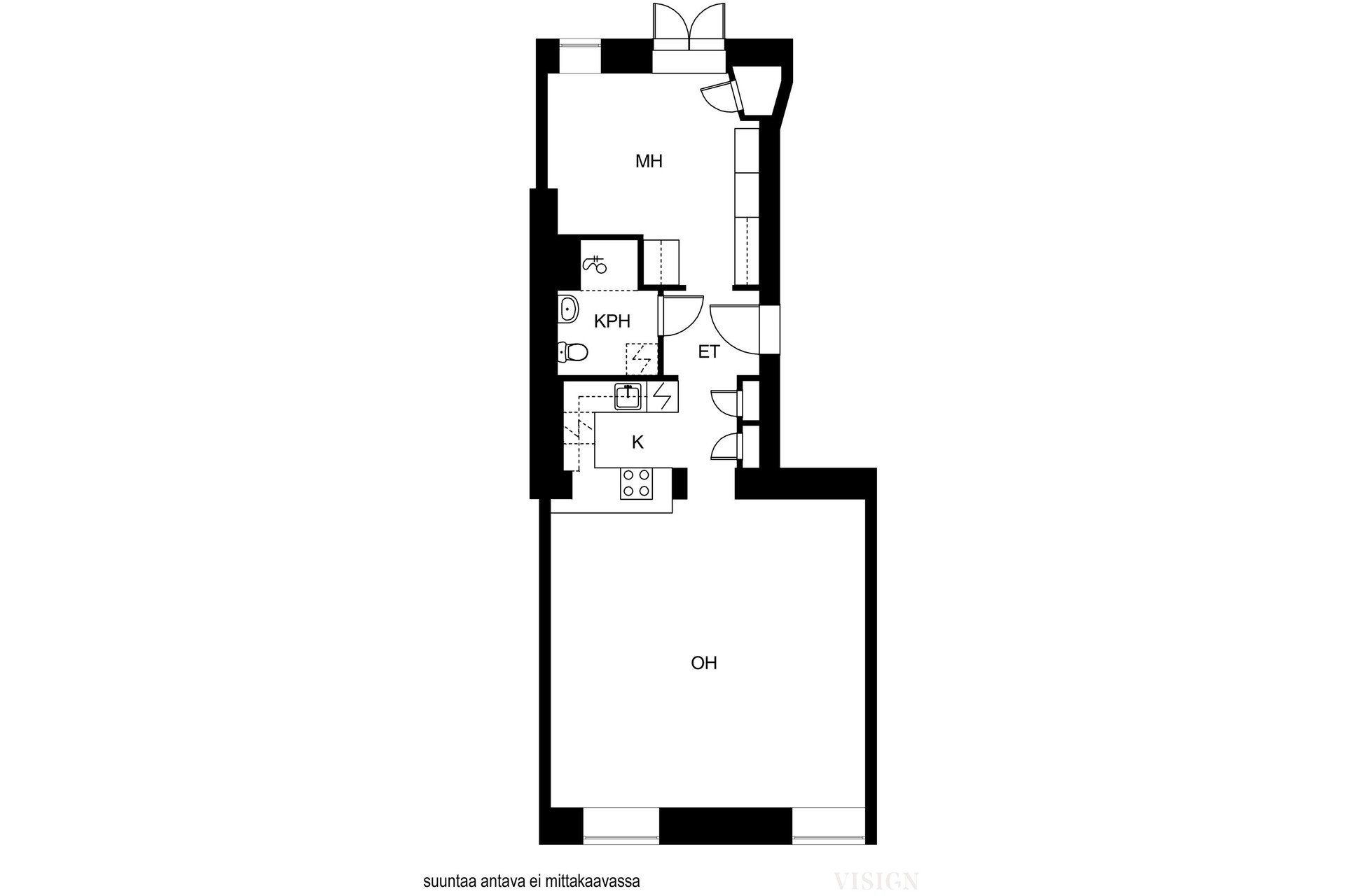 Avara olohuoneen ja keittiön yhdistelmä toimii erinomaisesti niin arjessa kuin juhlassakin. Vaaleat pinnat, laadukkaat materiaalit ja harkittu värimaailma viimeistelevät tilan yhtenäisen ilmeen. Erillinen makuuhuone tarjoaa rauhallisen oman tilansa.