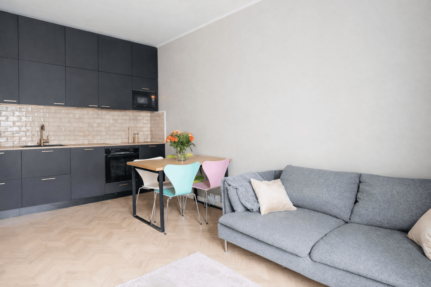 Musta KVIK- keittiö on yksinkertaisen tyylikäs ja hyvälaatuinen. Olohuone ja makuualkoviksi erotettu puoli muodostavat toimivan kokonaisuuden