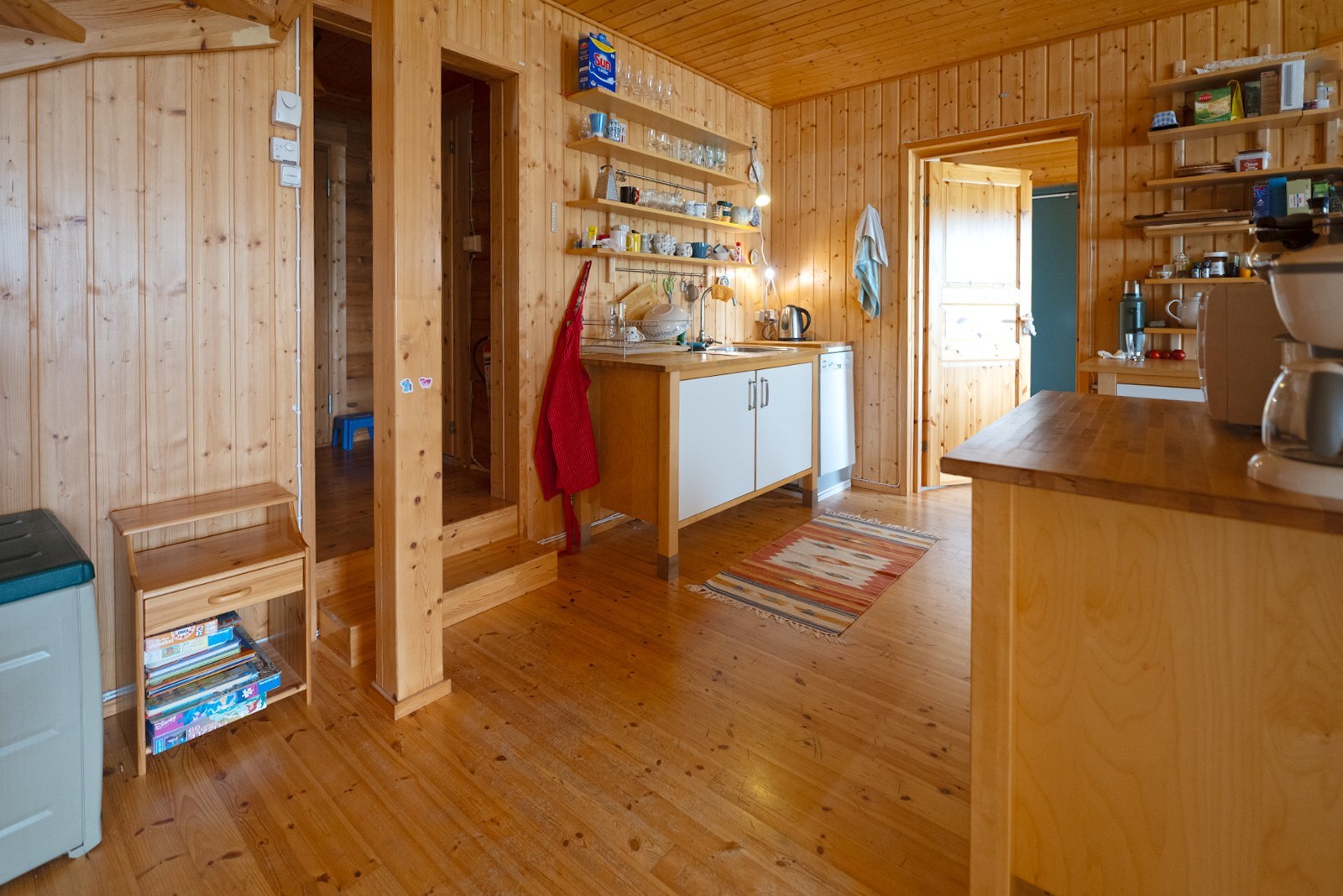 | Keittiön kuvaus | Liesi (sähköliesi), työtasot (laminaatti), seinät (puu), lattiat (lauta), liesi, astianpesukone, jääkaappi, erillinen pakastin, liesituuletin ja kiinteät valaisimet |