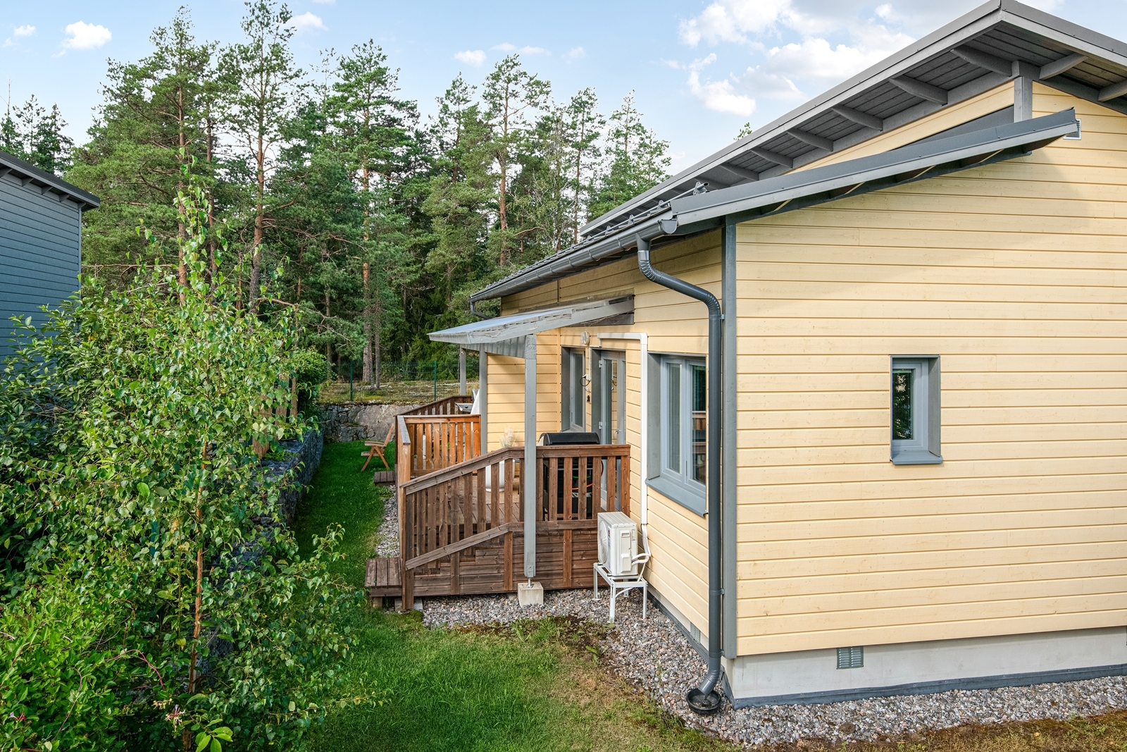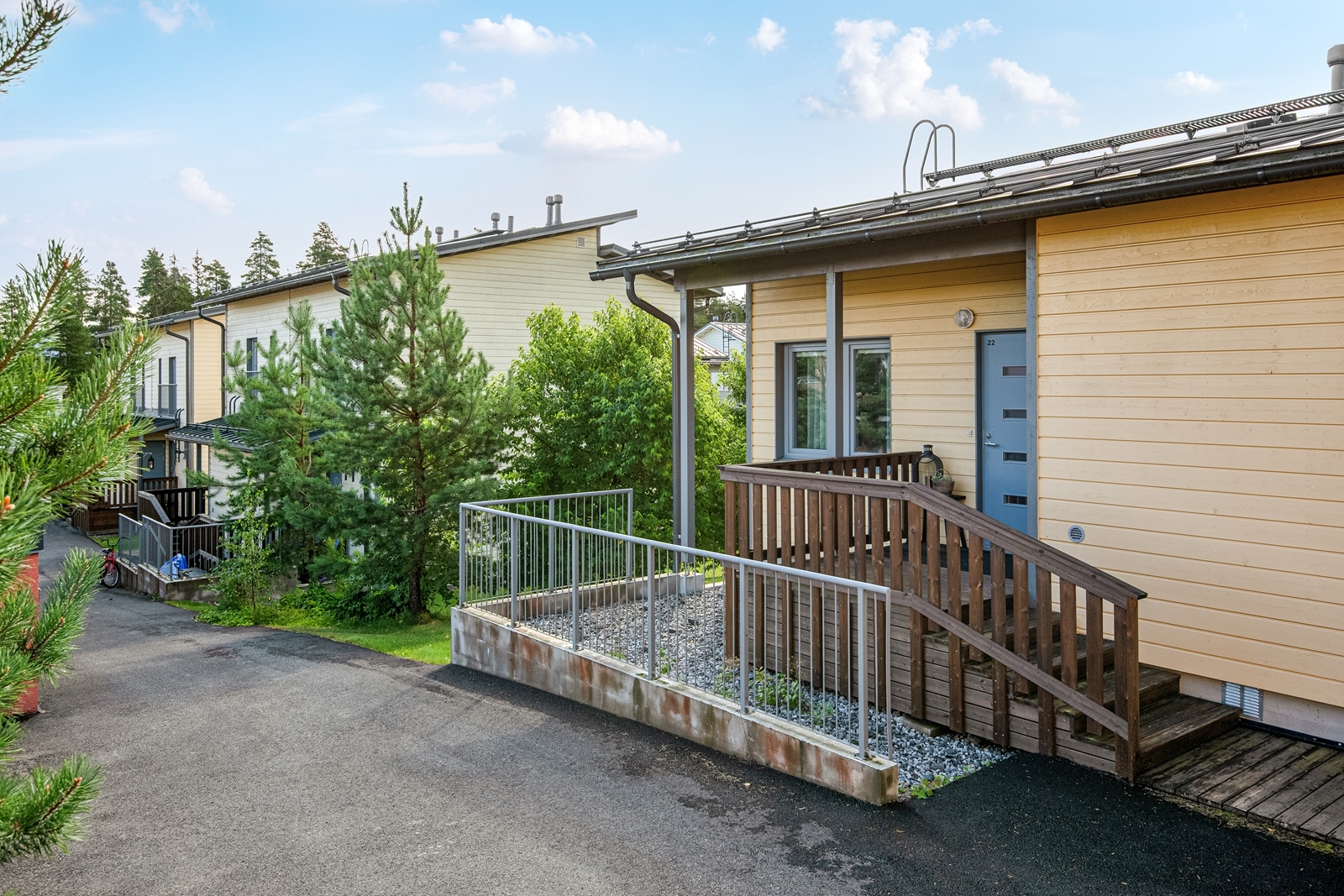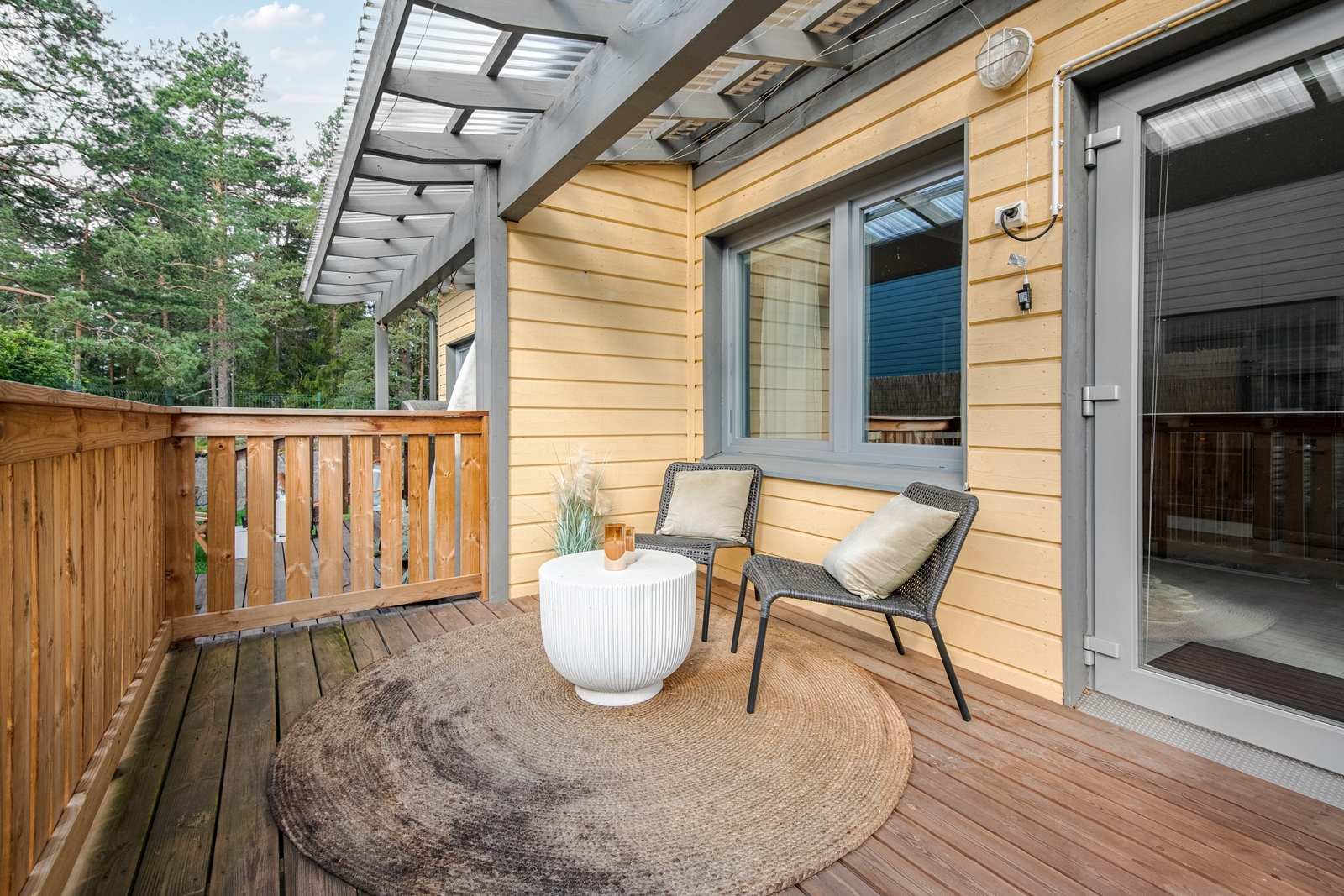 Viihtyvyyttä lisää kodin piha-alue terasseineen, etelään suuntautuvalla aurinkoisella terassilla kelpaa nautiskella kesäpäivistä. Myös sisääntulon yhteydessä on pieni piha-alue.