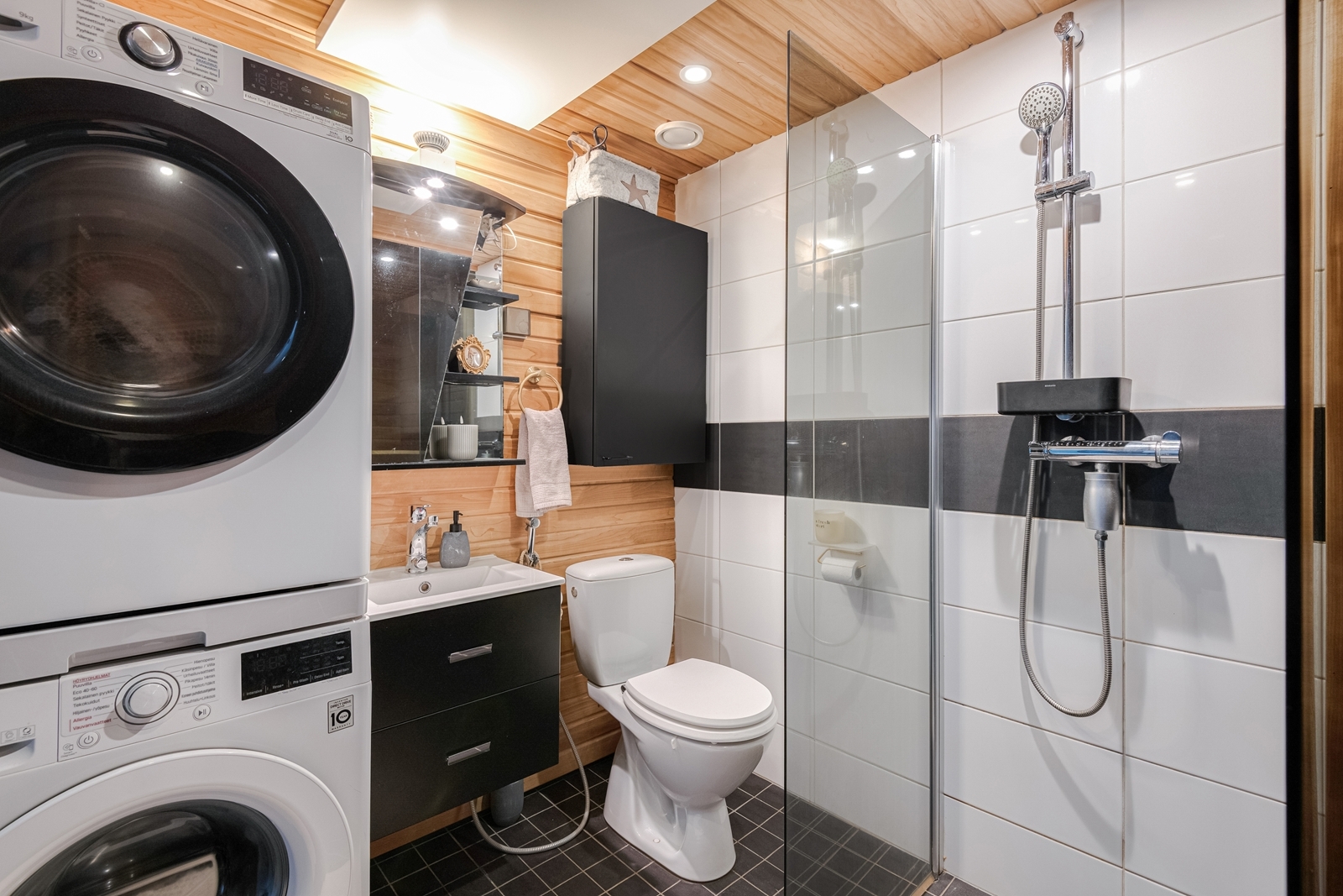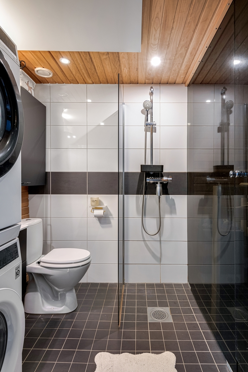 | Kylpyhuoneen kuvaus | Suihku, wc-istuin, peilikaappi, pesukoneliitäntä, allaskaappi ja kiinteät valaisimet, seinät (kaakeli ja puu), lattiat (laatta) |