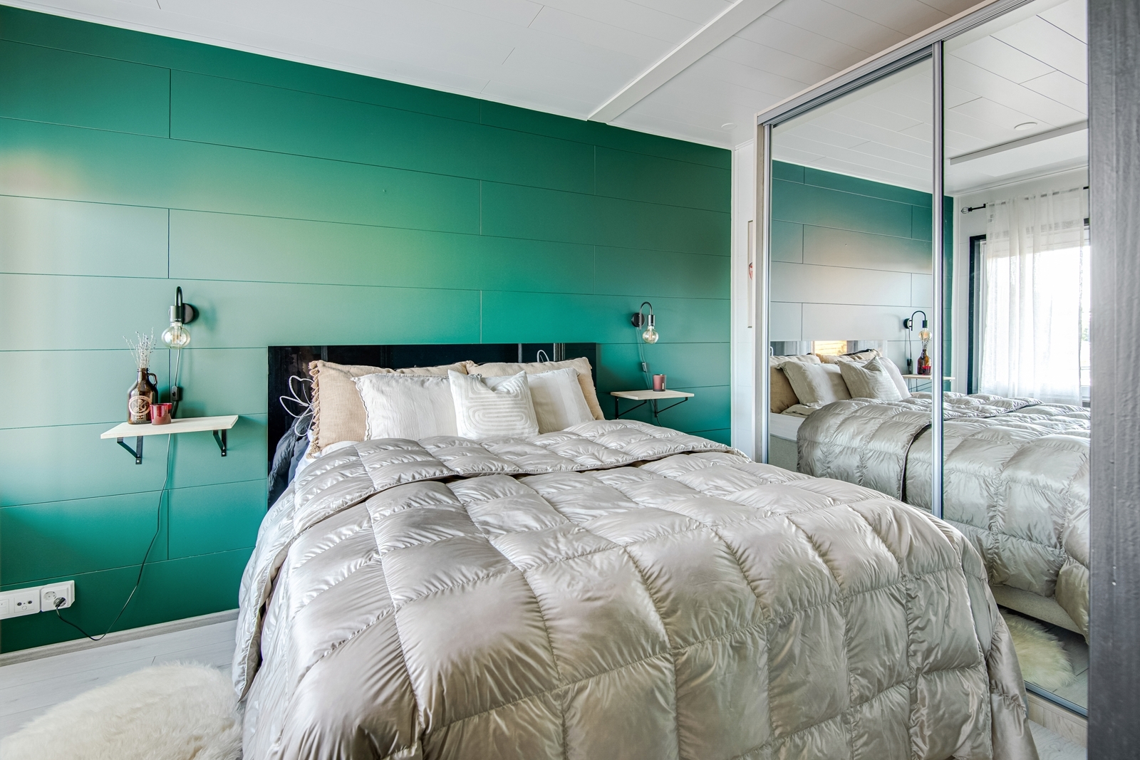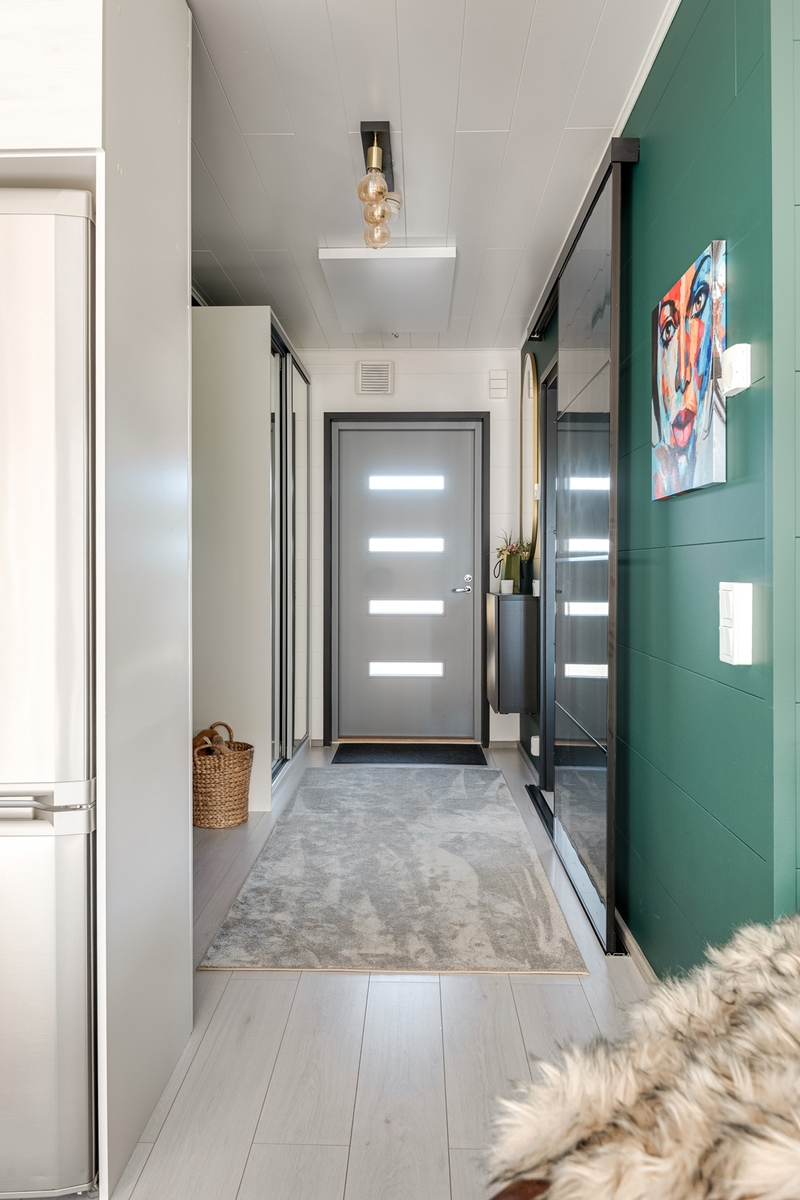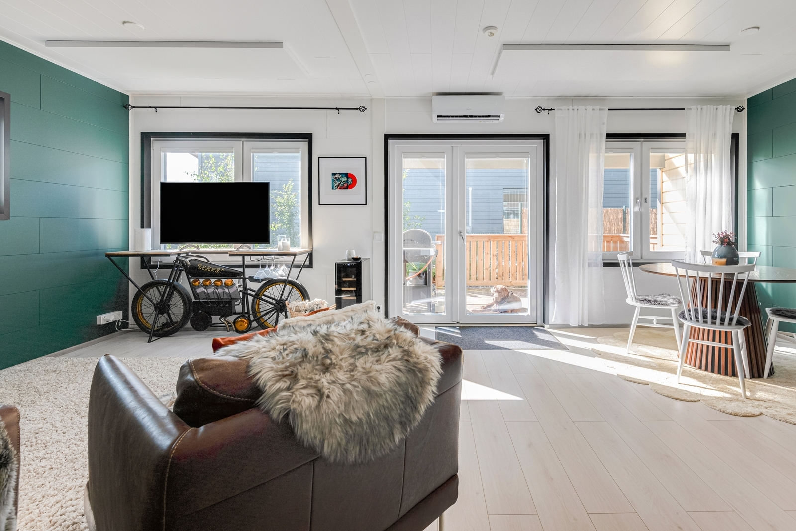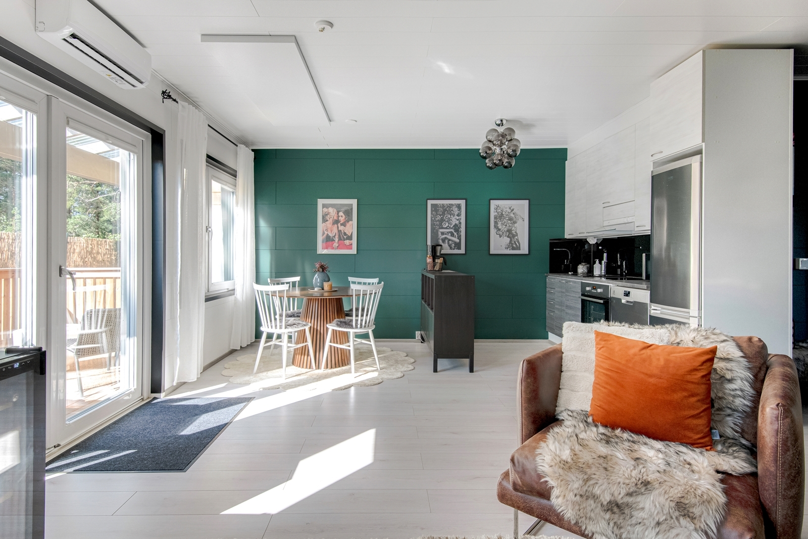 Koti on poikkeuksellisen valoisa ja neliöihin nähden hyvin avaran oloinen. Olohuoneen ja keittiön muodostaman yhtenäinen tila on vaikuttava. Makuuhuone on juuri sen kokoinen kuin sen tarvitseekin olla. Siistin kylpyhuoneen yhteydessä on myös hieno lasiseinäinen sauna. Viihtyisyyttä lisää asuntoon asennettu ilmalämpöpumppu, joka tuo helpotusta helteisinä päivinä ja tuo asumismukavuuden uudelle tasolle.