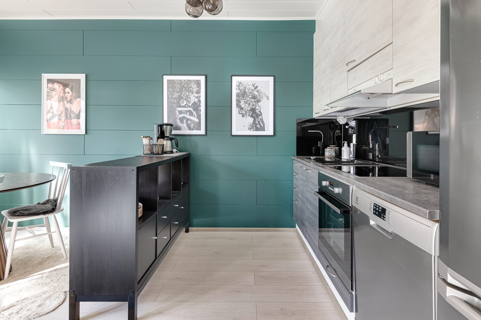 | Keittiön kuvaus | Liesi (Keraaminen liesi ja erillisuuni), työtasot (laminaatti), lattiat (laminaatti), erillisuuni, liesituuletin, jääkaappipakastin, astianpesukone ja kiinteät valaisimet |